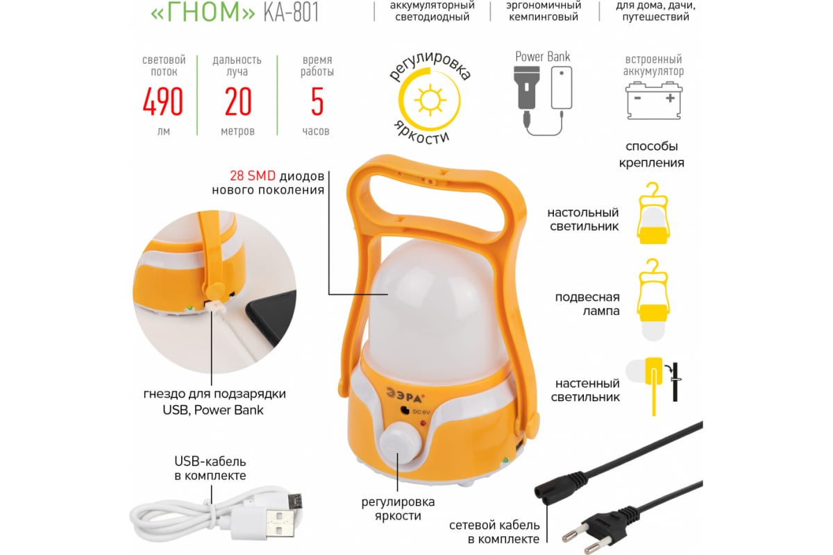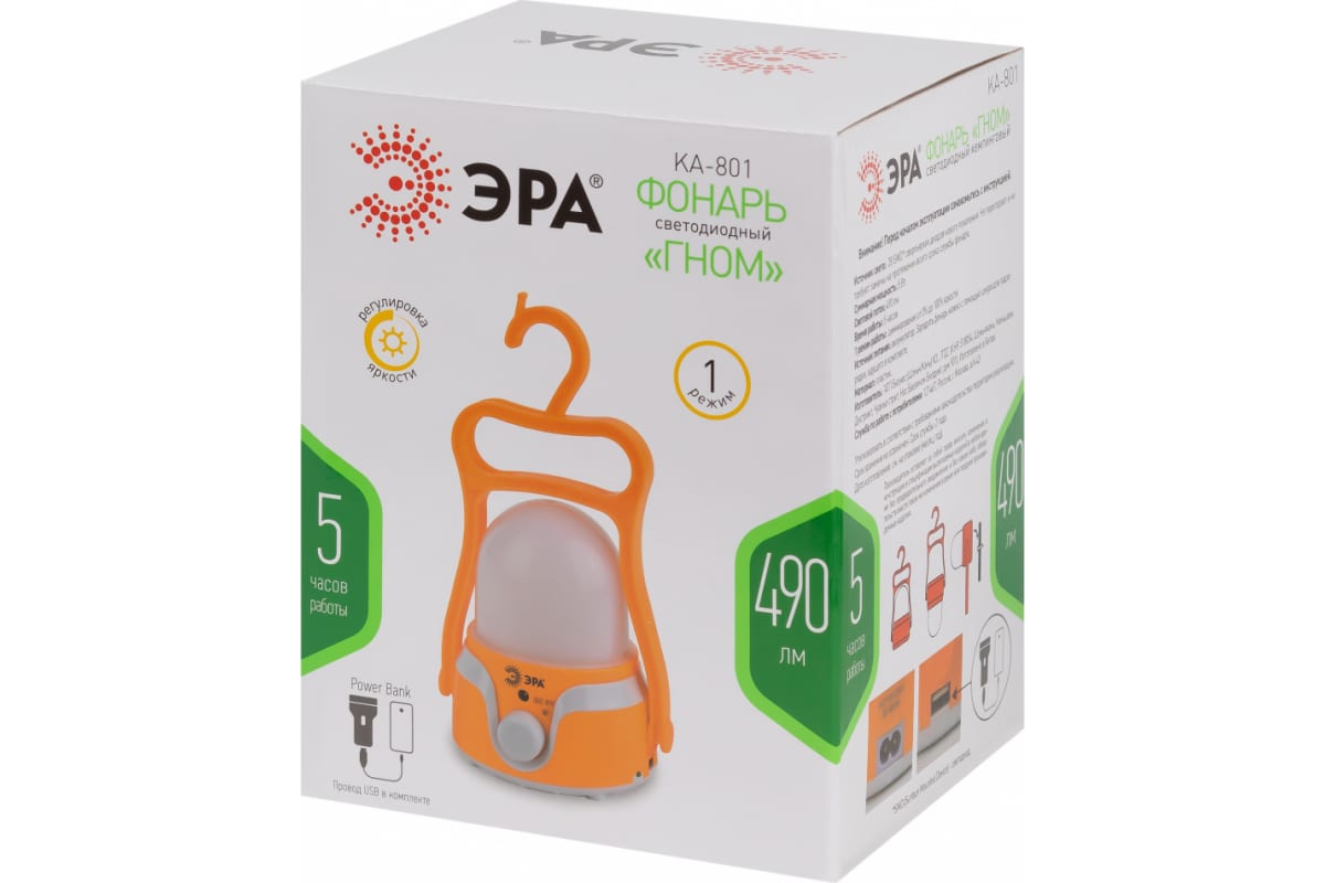 Кемпинговый светодиодный аккумуляторный фонарь ЭРА KA-801 Гном 4 Вт, 1700мАч 5V, USB, Б0054040 - эргономичный кемпинговый LED-фонарь с удобной ручкой и диммированием яркости. Работает от встроенного аккумулятора, подзаряжается от USB-кабеля, поставляемого в комплекте.