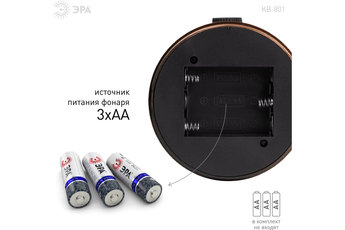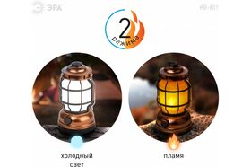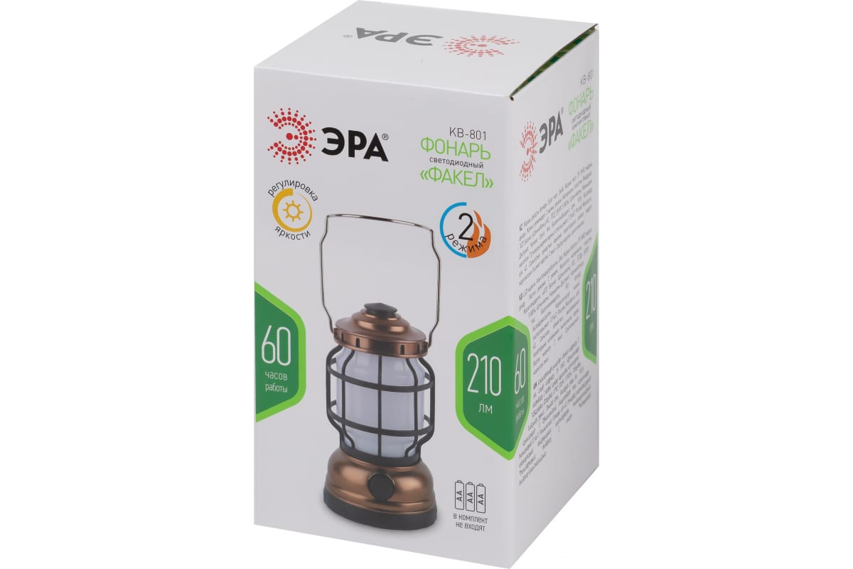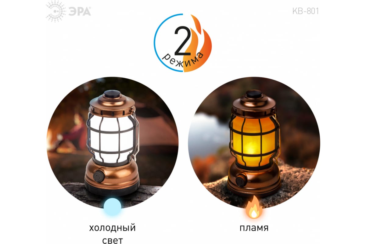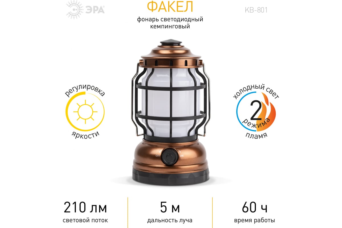 Светодиодный кемпинговый фонарь ЭРА KB-801 Факел на батарейках 2 режима холодный+пламя Б0054042 - кемпинговый фонарь в ретро-стиле. Светит в 2 режимах – холодный белый свет и режим теплого пламени. Работает от 3 пальчиковых батареек (3 х АА). Одного комплекта алкалиновых элементов питания хватает на 60 часов непрерывного свечения.