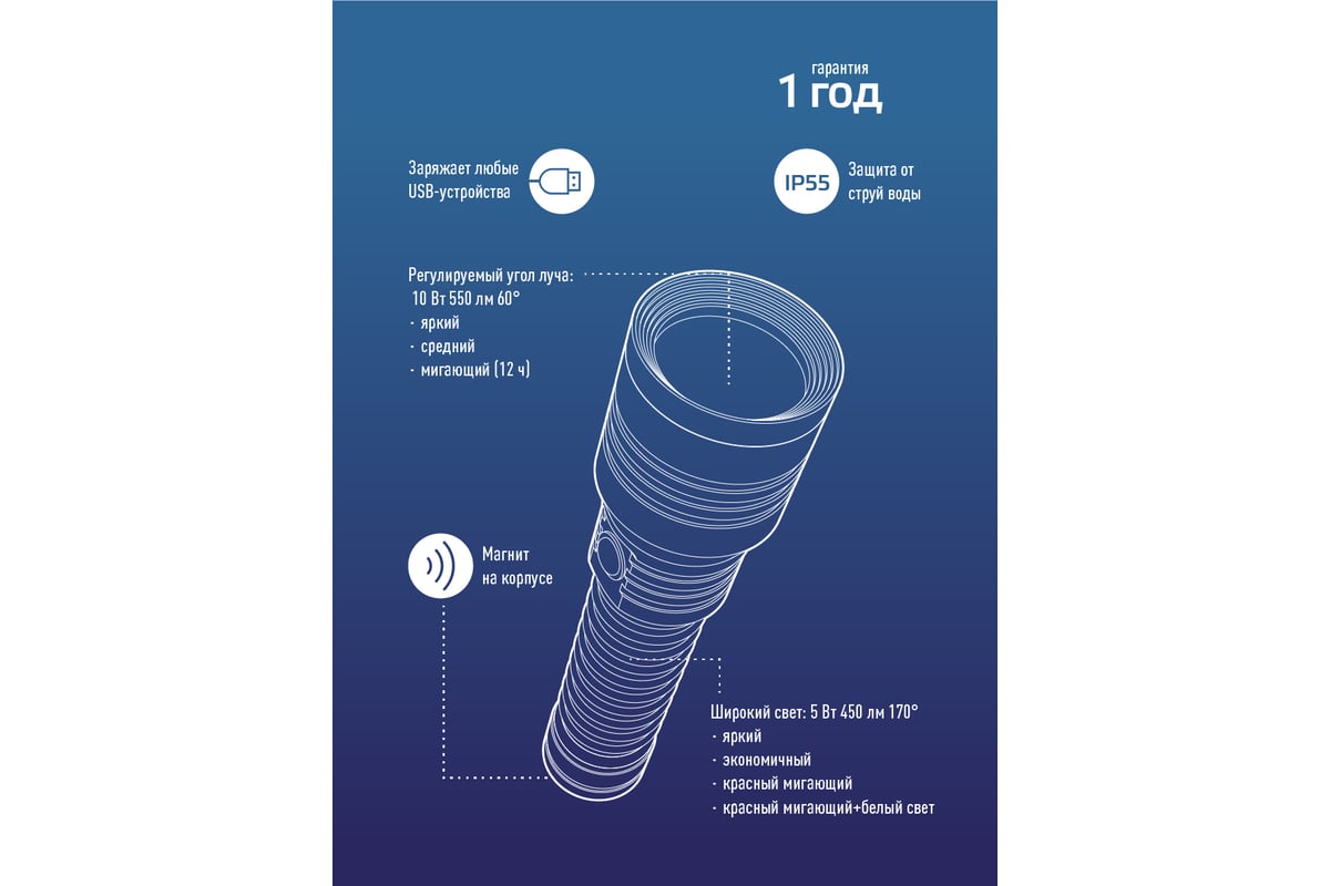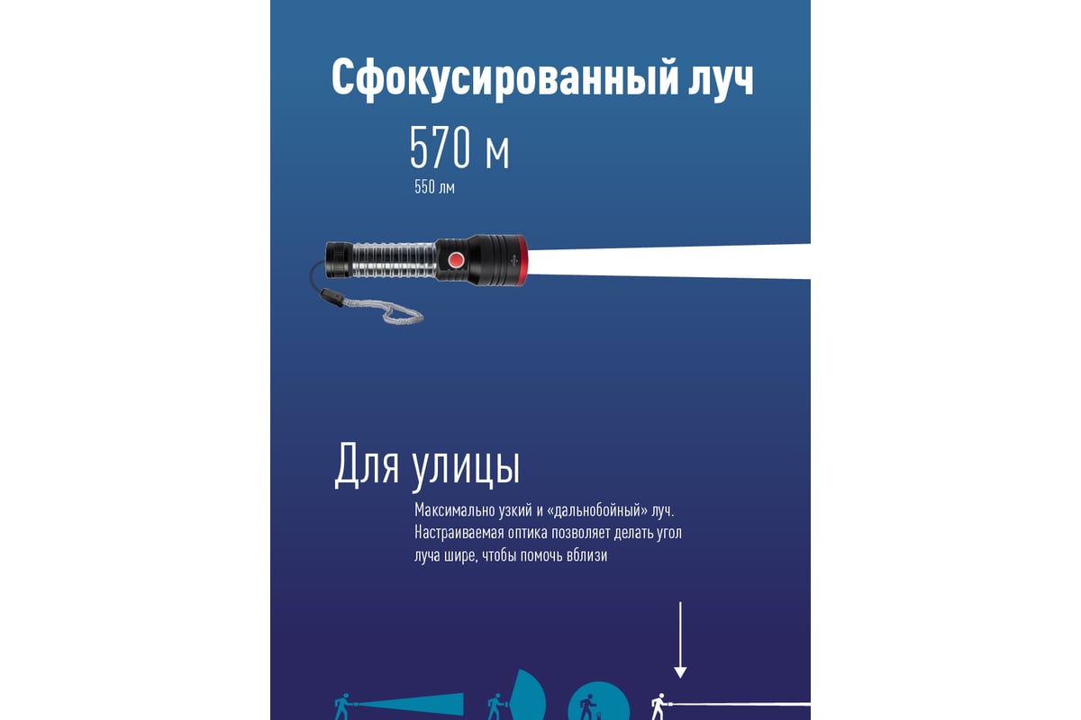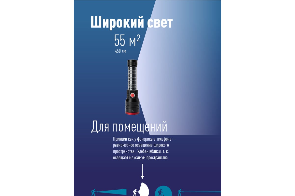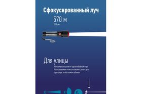 -Дистанция освещения: 570 м. (луч)/55м2 (широкий свет, боковой светильник).