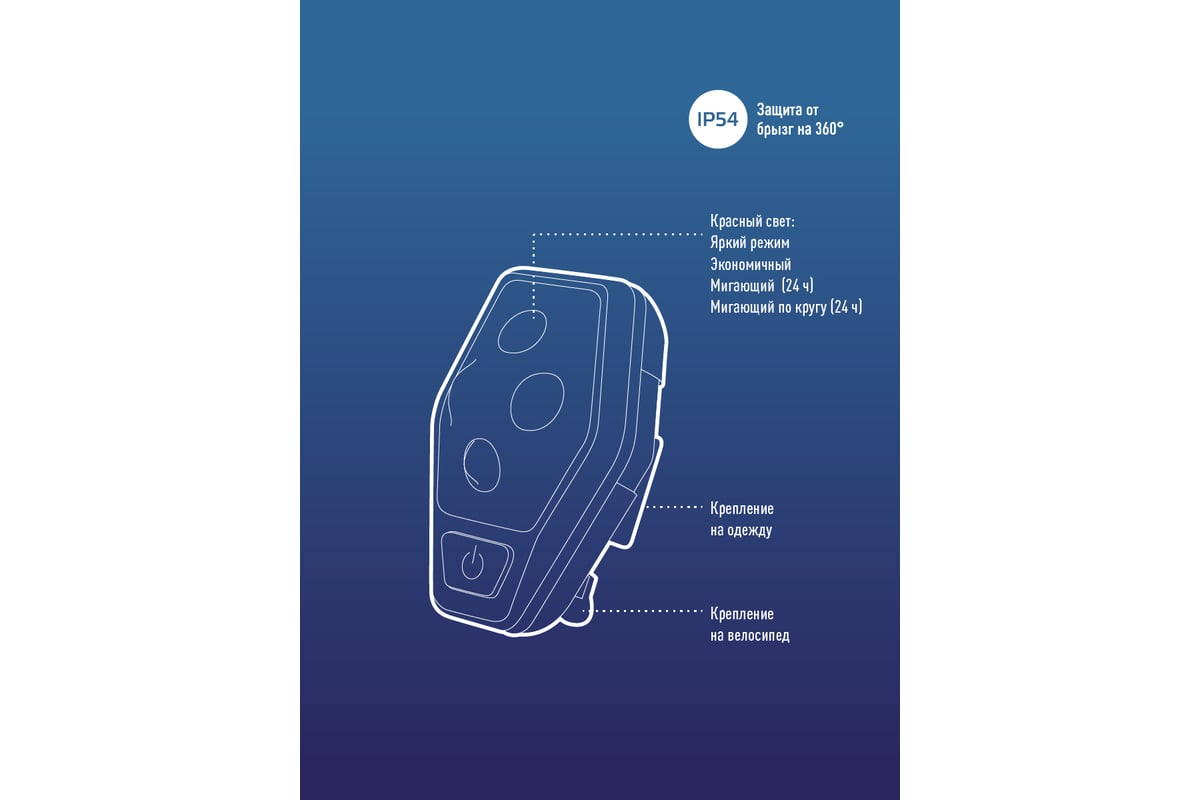 -Четыре режима красного света - яркий, средний, мигающий и особый режим кругового мигания - до 24 часов работы в мигающем режиме.