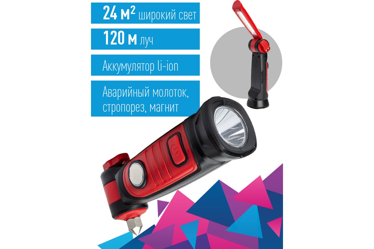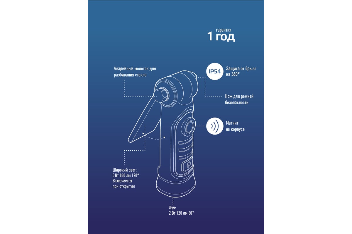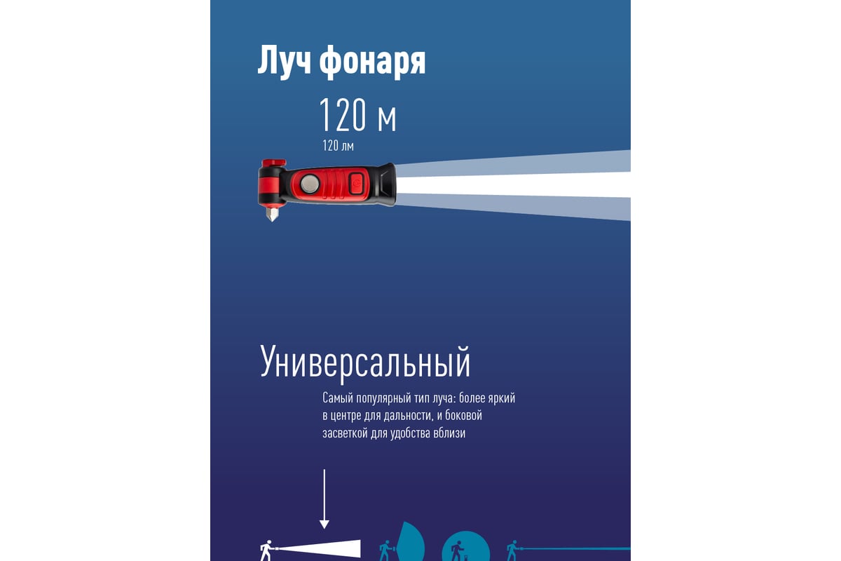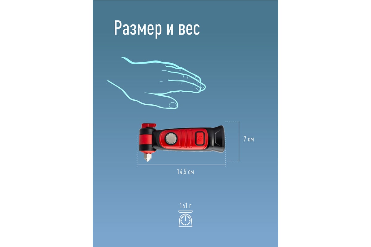 Магнит на корпусе дает возможность закрепить свет прямо под капотом. На случай аварии - на корпусе аварийный молоток и стропорез для ремней безопасности.