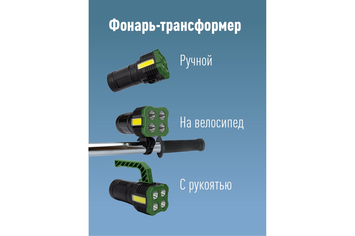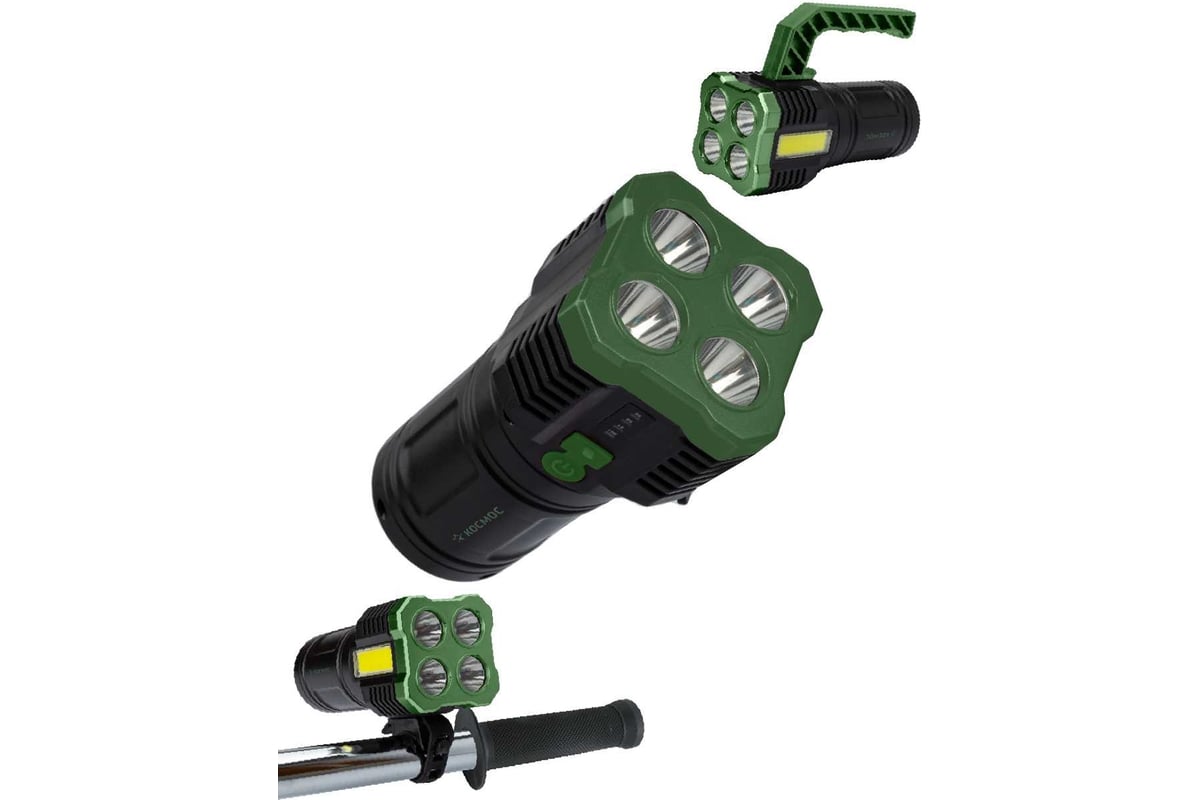 Фонарь прожектор ручной КОСМОС (KOC902Lit) - внешний вид в стиле хай-тек не только похож на популярных роботов-трансформеров, сам фонарь им и является. Светит 4-мя светодиодами, для получения мягкого фокусного пятна луча. Переключив режим, вы получаете светильник широкого света, который удобно носить в руке, как факел, или поставить на поверхность. Также в комплекте есть верхняя ручка для длительных прогулок и крепление на руль велосипеда. Процент заряда батареи отображается на умном индикаторе.