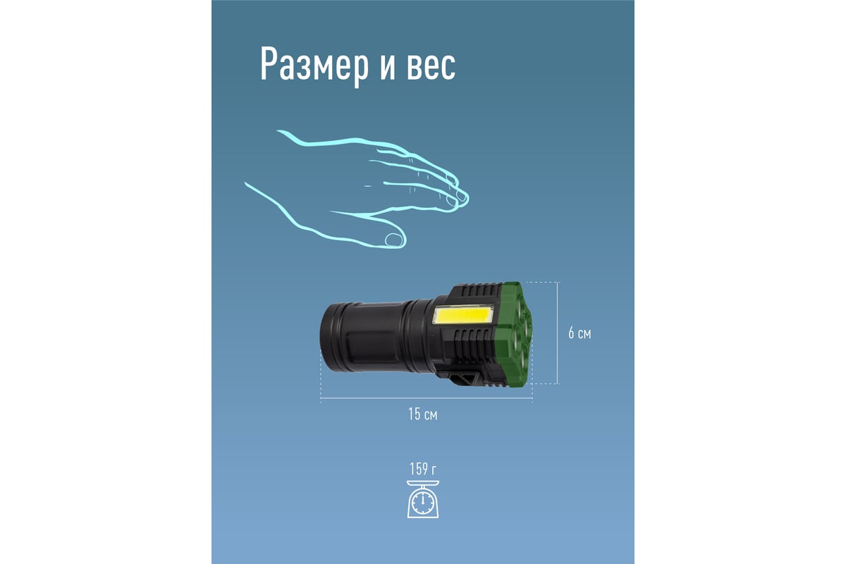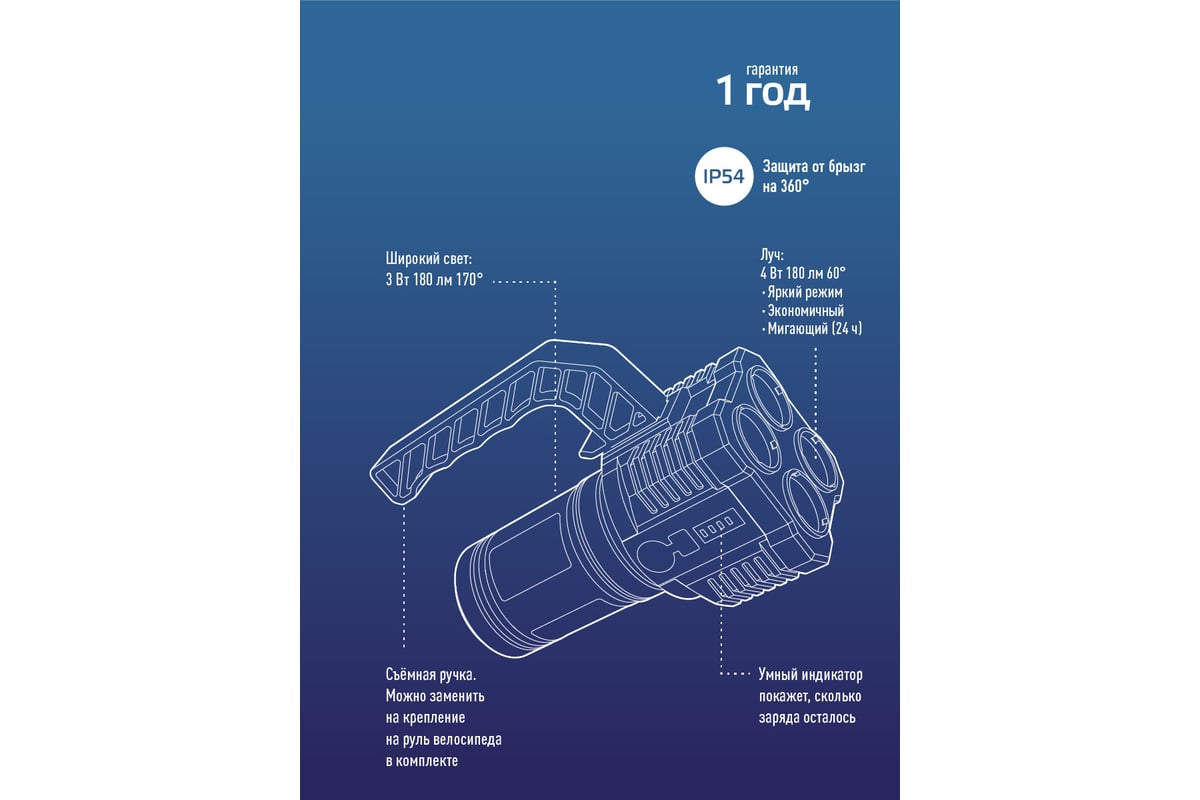 -Количество режимов: 4 (луч яркий, средний, мигающий/боковой светильник).