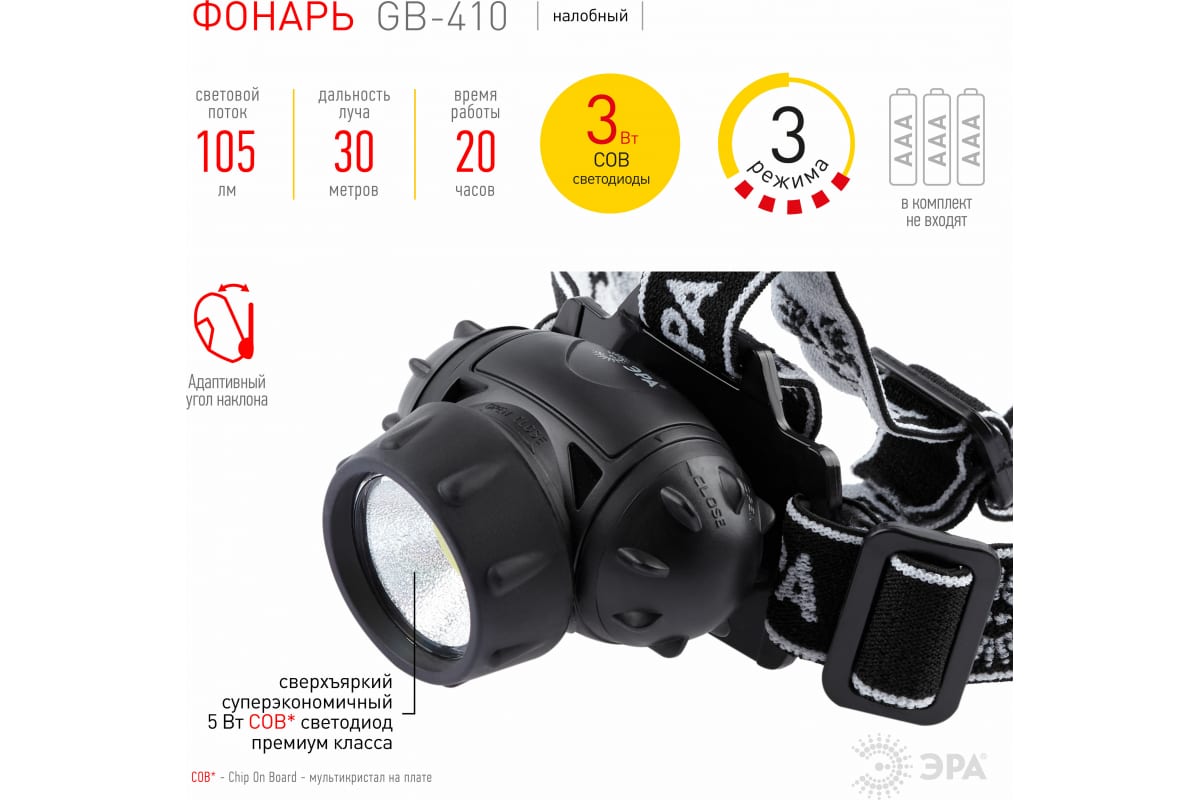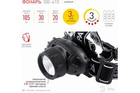 1.Налобный светодиодный фонарь ЭРА GB410 на батарейках 3хААА, 3 режима, черный, IP44 Б0051463 станет надёжным помощником в походах, при 2.выполнении строительных, ремонтных и бытовых работ.