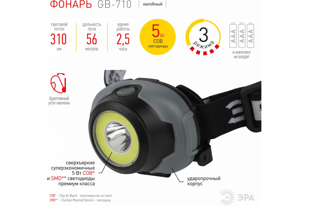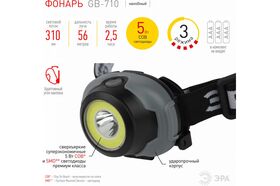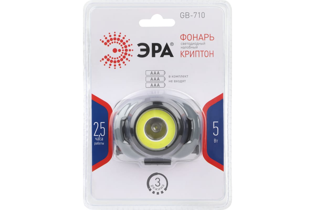 Налобный светодиодный фонарь ЭРА GB-710 Криптон, на батарейках, 3 режима, 5 Вт, СОВ, 3хААА Б0052752 - 3-режимный налобный фонарь с круглой LED-платой.