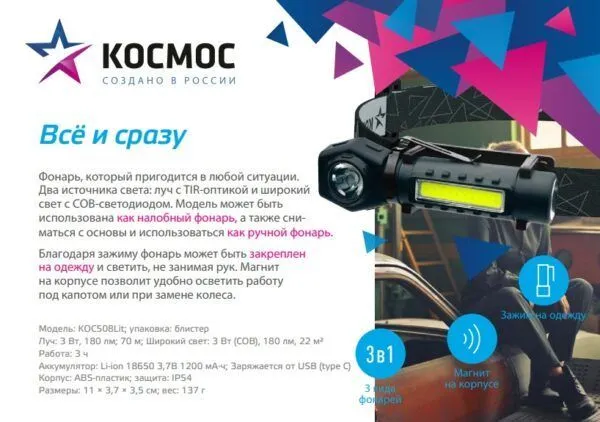 Технические характеристики КОСМОС аккум/3Вт+3ВтCOB/кол. линза/Li-ion18650 1200mAh/USBtC/магнит/зажим KOC508Lit