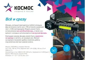 Фонарь налобный КОСМОС (KOC508Lit) - фонарь, который пригодится в любой ситуации. Два источника света: луч с TIR-оптикой и широкий свет с COB-светодиодом.