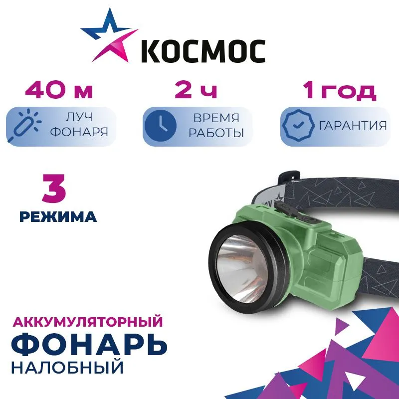 Фонарь налобный КОСМОС (KOC516Lit) - базовый свет. Классический налобный фонарик с ярким лучом. То, что нужно для хозяйства и дачи: надежная и простая модель.