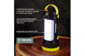 Встроенная функция powerbank + green energy позволяет заряжать фонарь от солнечных лучей, а в случае необходимости производить зарядку гаджетов через встроенный USB-порт.