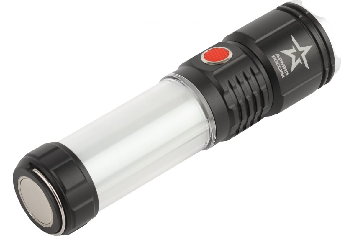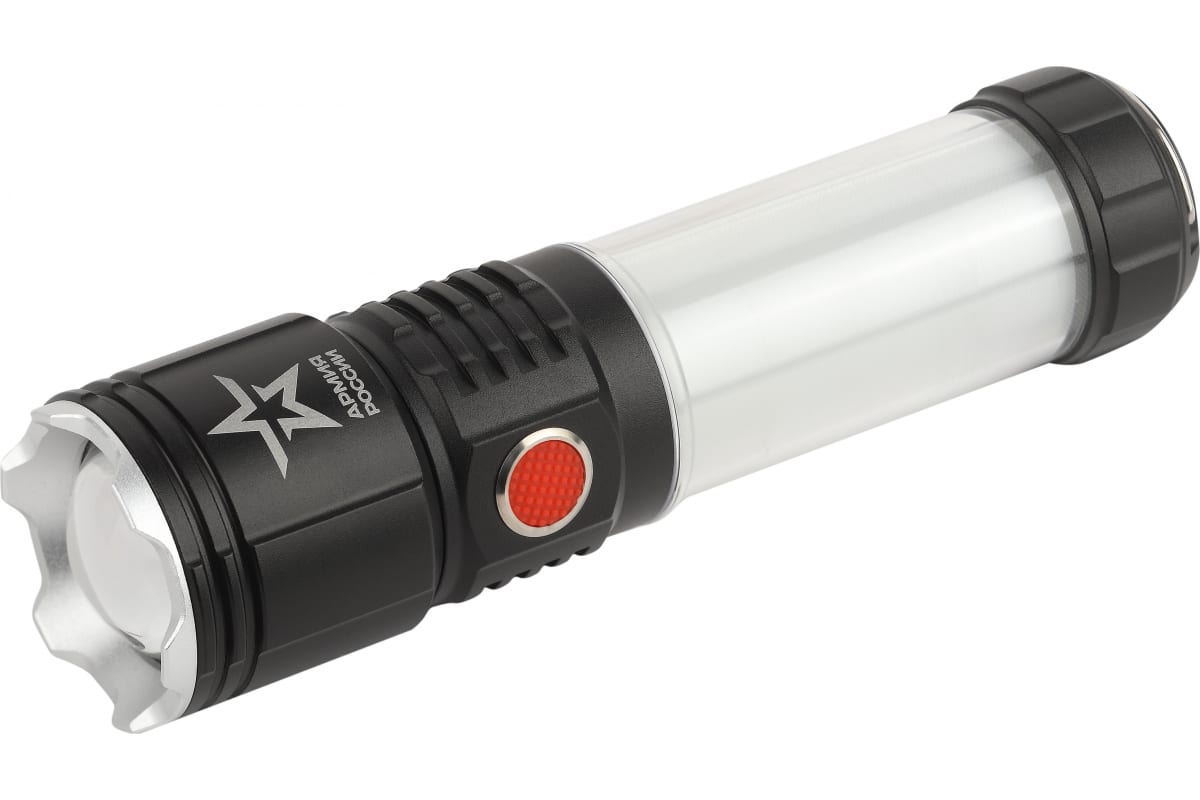 Серия фонарей Армия России - совместный проект отечественного бренда ЭРА и АО "Военторг", действующего на основании лицензии Министерства обороны РФ. Фонарь оснащен емким литиевым аккумулятором (2100 мАч), одного заряда хватает на 10 часов непрерывной работы. Зарядное устройство в комплекте.