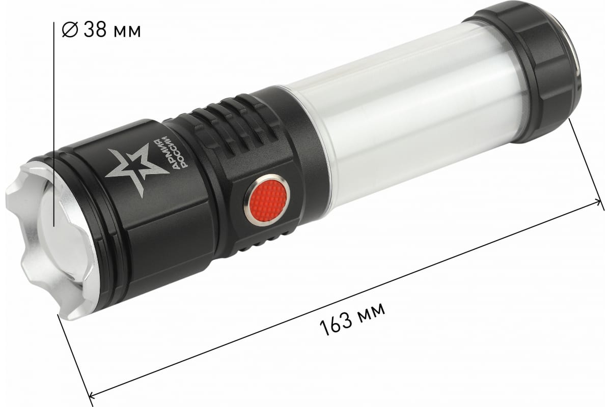 Армия России Тайфун выглядит отлично. Благодаря необычному фактурному дизайну корпуса и тщательной сборке его приятно держать в руках, а за счет продуманного функционала им приятно пользоваться. Фонарь украшает фирменная звезда Армии России - знак качества и особого статуса бренда. Аккуратная красная кнопка включения - дополнительный дизайнерский бонус.