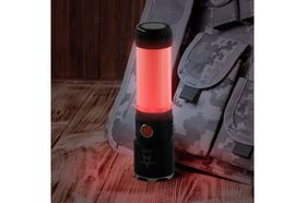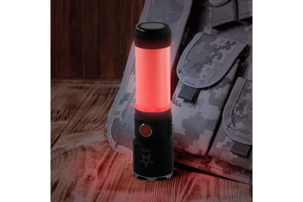Ручка фонаря Армия России "Тайфун" светится белым и красным светом. Есть режим мерцания.
