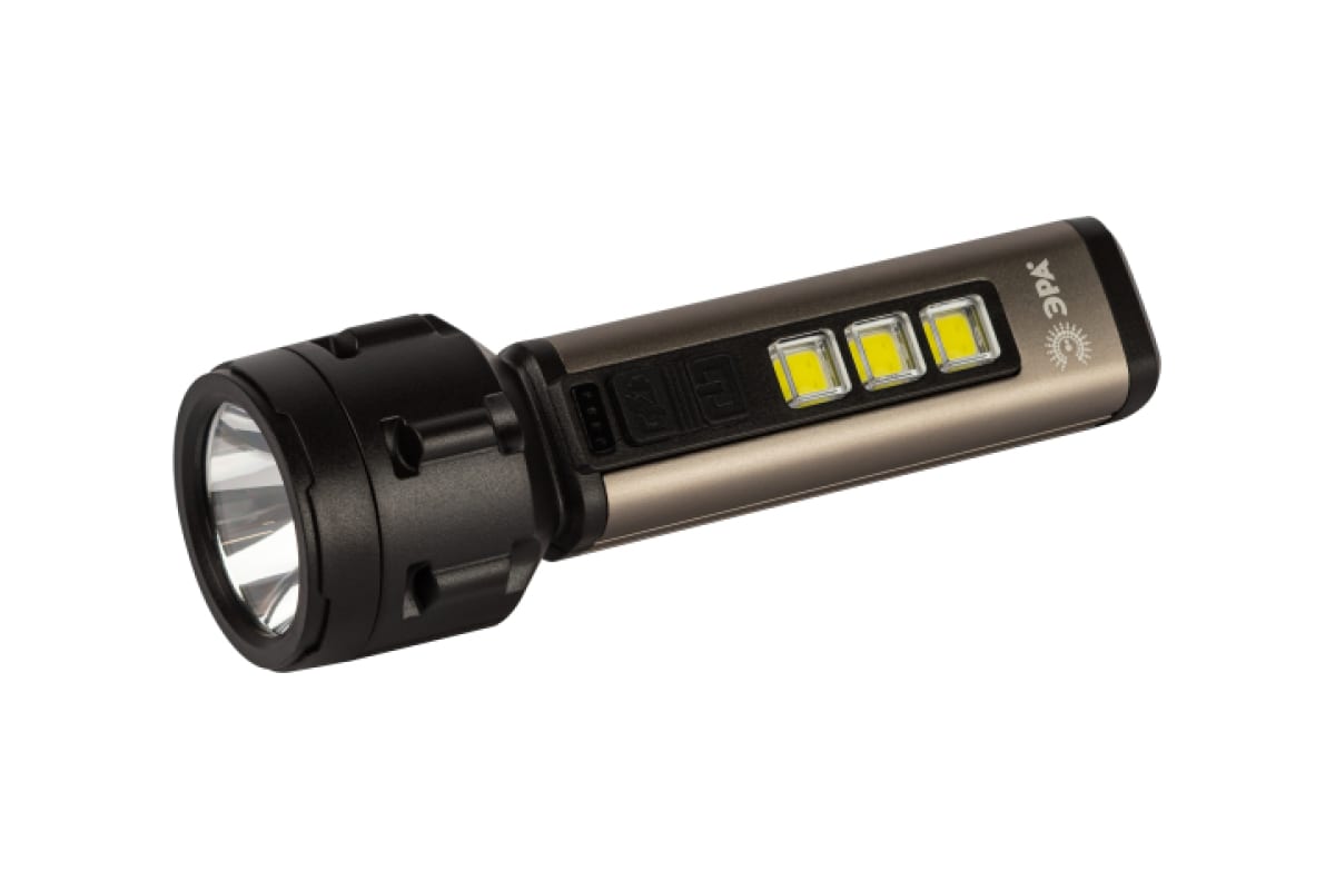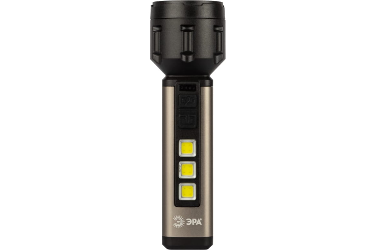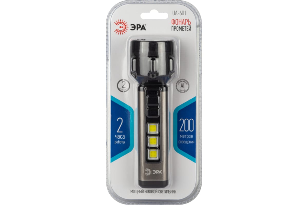 ЭРА UA-601 «Прометей» - аккумуляторный ручной фонарь с мощным 3-сегментным боковым светильником. Уникальный для российского рынка дизайн. Яркий головной луч (1 SMD-светодиод) дальностью до 200 метров помогает качественно освещать дорогу или подсвечивать конкретные предметы. Боковой светильник, состоящий из 3 компактных, но очень ярких COB-матриц с инновационными микросветодиодами, формирует широкое заливающее освещение.