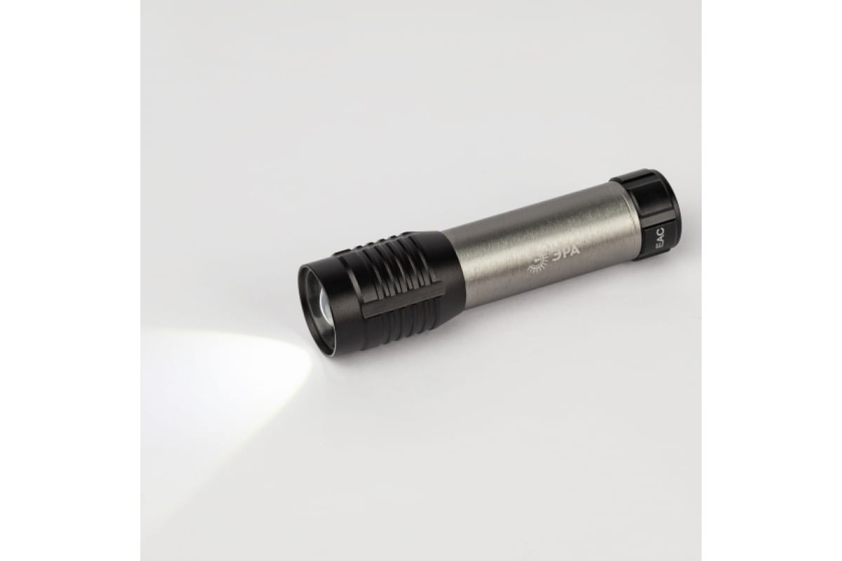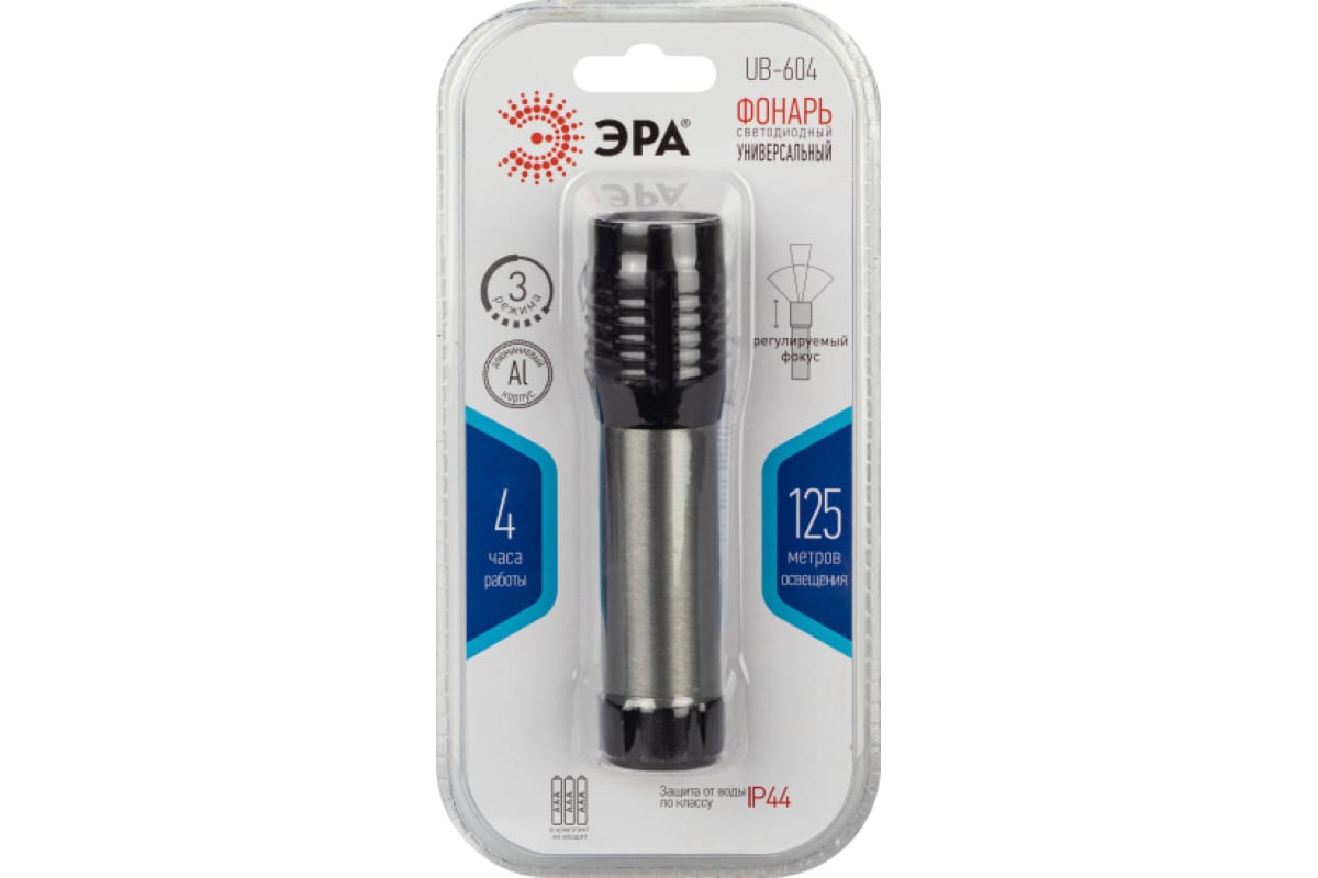 ЭРА UB-604 – ручной LED-фонарь с регулируемой фокусировкой луча. Мощность светодиодного фонаря – 5 Вт. Удобно использовать как кемпинговый фонарь, рабочий фонарь. Отличный вариант подарка для мужчины. Этот влагозащищённый фонарь (IP44) можно успешно применять на улице. Светодиодный ручной фонарь ЭРА UB-604 работает от 3 мизинчиковых батареек (ААА). В фонаре установлен мощный яркий светодиод с дальностью света до 125 метров. Световой поток – 415 Лм. Для разных ситуаций применения предусмотрены 3 режима работы: максимальная яркость, 50% яркости, стробирование. Сверхъяркий, суперэкономичный светодиод. Не требует обслуживания и замены на протяжении всего срока службы фонаря.