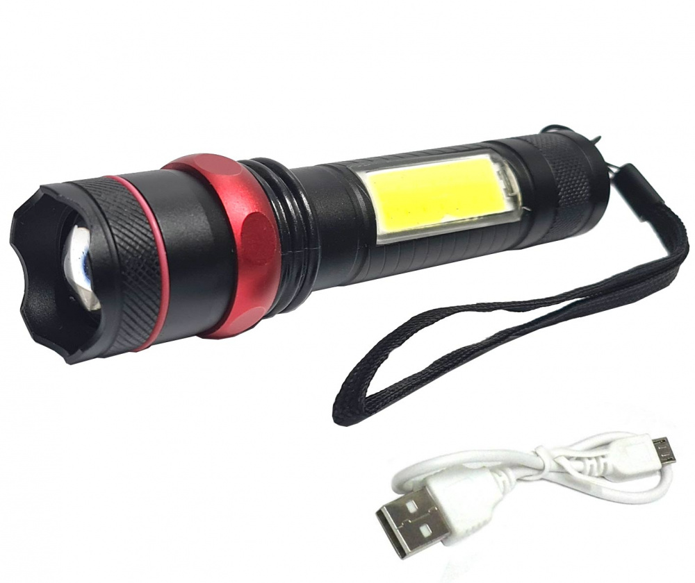 Металлический ручной фонарь с функцией ZOOM с головным и боковым светодиодами.