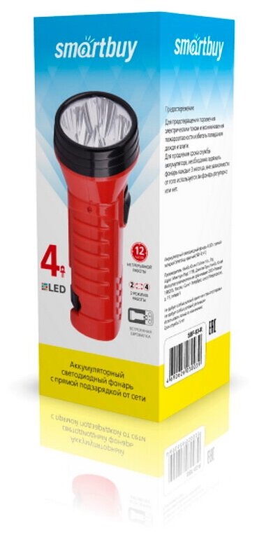 тип светового элемента: 4 светодиода; используется свинцово-кислотный аккумулятор 4V 0.5 Ah; встроенная вилка "Евростандарт"; до 12 часов непрерывной работы; время перезарядки 3-6 ч; тип аккумулятора: SLA; встроенная электровилка