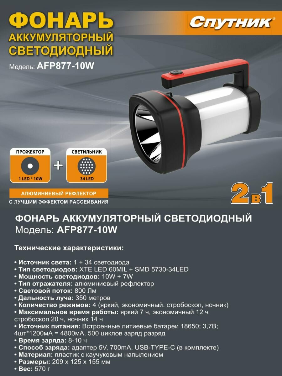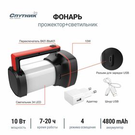 -Количество режимов работы: 4 (полная яркость (100%), частичная яркость (50%), STROBE, светильник-ночник.