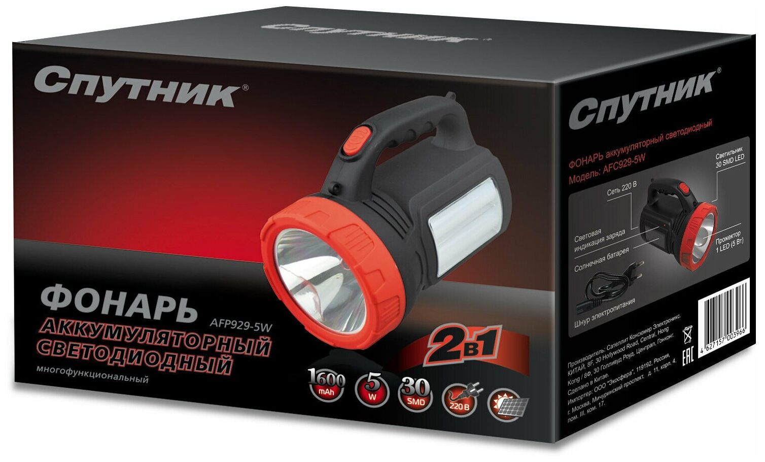 Фонарь аккумуляторный светодиодный AFP929-5W; Плечевой ремень; Шнур электропитания с вилкой; Гарантийный талон и руководство по эксплуатации; Индивидуальная цветная упаковка