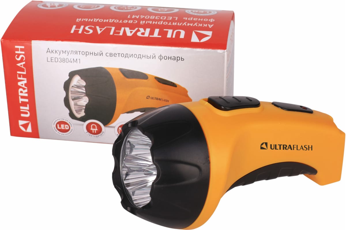 Аккумуляторный фонарь Ultraflash LED3804M1 (220В, желтый/черный, 5 LED, SLA, пластик, коробка) 14930 заряжается напрямую от сети 220 В. Время заряда 7 ч.