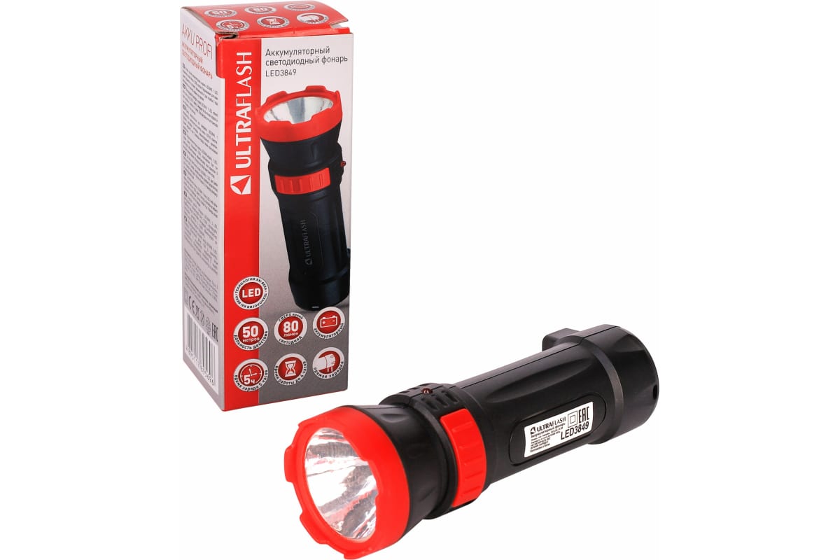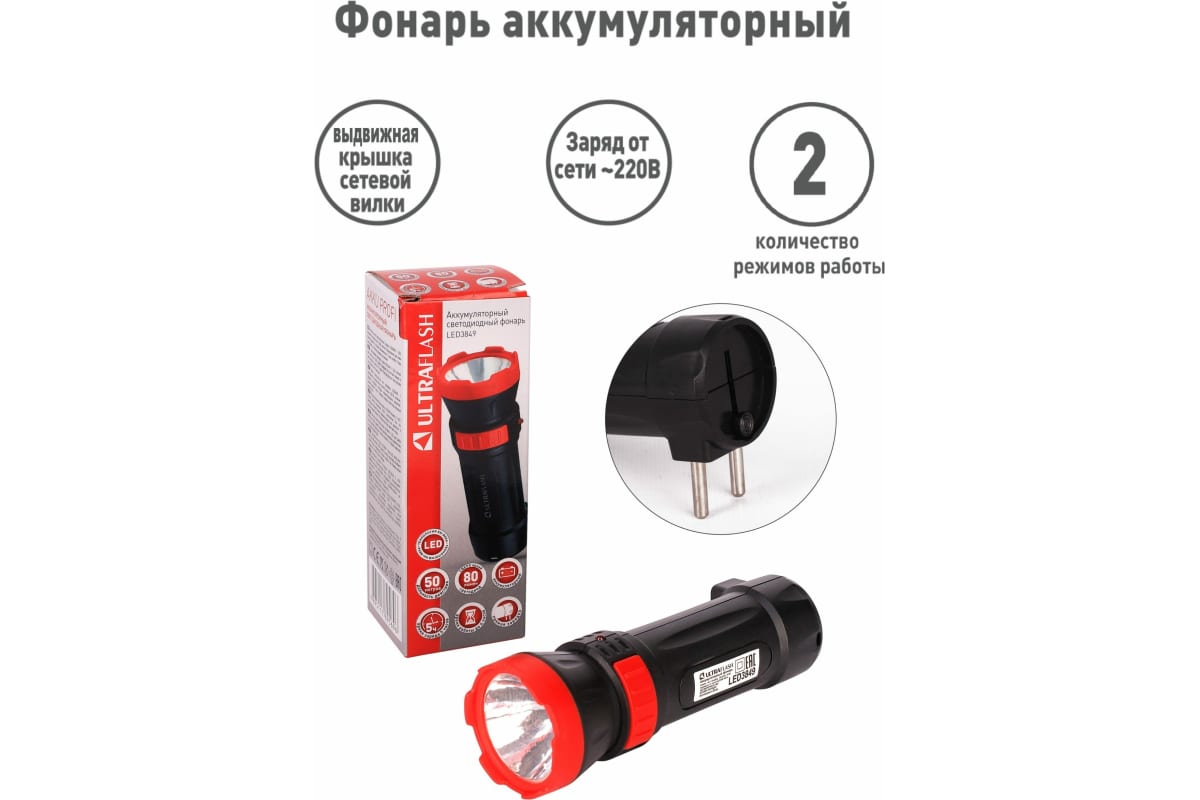 Аккумуляторный фонарь Ultraflash LED3849 (220В, черный, 1 LED, 2 режима,SLA, пластик, коробка) 14931 заряжается напрямую от сети 220 вольт. Время заряда 5 ч.