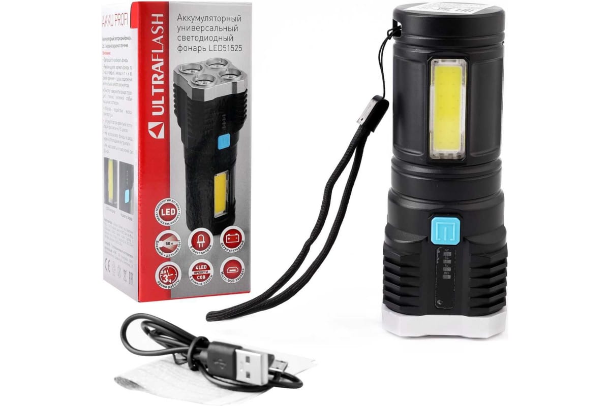 Фонарь Ultraflash электрический светодиодный аккумуляторный с боковой подсветкой.