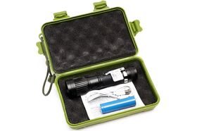 Работает от сменного аккумулятора Li-Ion. Источник света - светодиоды точечный Т6 и COB с потребляемой мощностью 3 ватт с цветовой температурой 6500К и световым потоком до 400 люмен. Дистанция освещения - до 250 метров.
