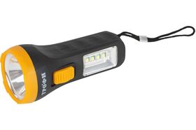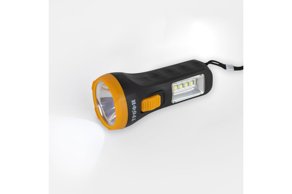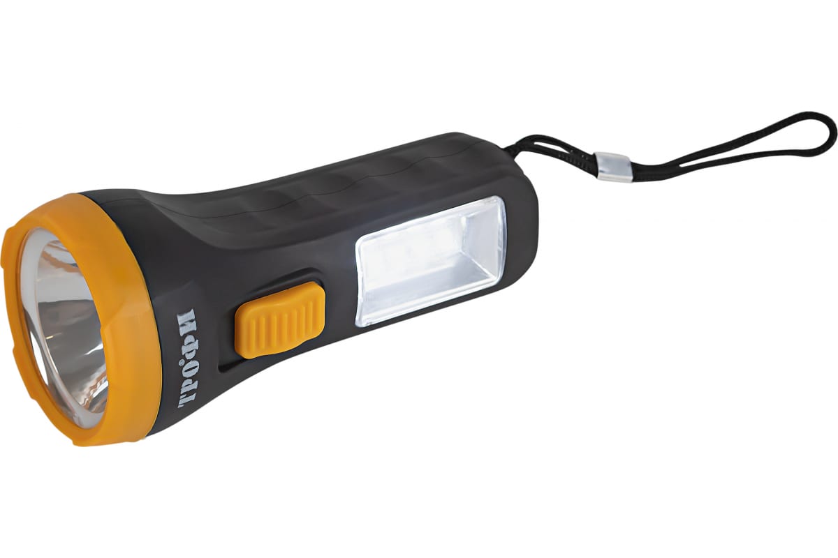 Светодиодный ручной фонарь ТРОФИ UB-101 универсальный на батарейках 1Вт 1 SMD+4 LED 1хAA Б0054034 - универсальный светодиодный фонарь, работающий от 1 пальчиковой батарейки (1хАА). Лёгкий прочный корпус позволяет с комфортом использовать этот портативный фонарь, брать его с собой даже на большие расстояния, в длительные путешествия. Особое удобство при использовании обеспечивает эргономичная ручка с углублениями для пальцев, ребристая нескользящая кнопка включения. Фонарь создает два типа освещения: основной свет в виде направленного луча (1 LED) и боковой светильник (4 SMD). От одной алкалиновой батарейки непрерывно светит 15 часов.