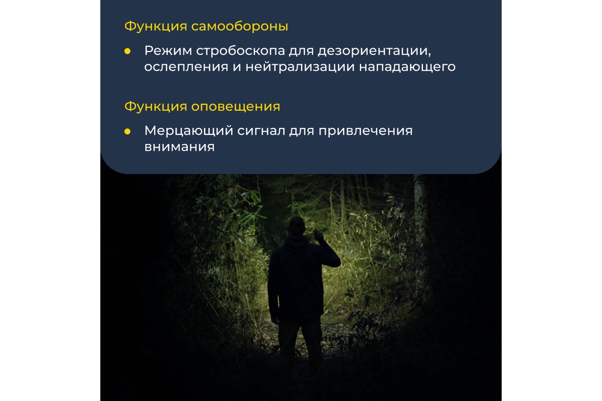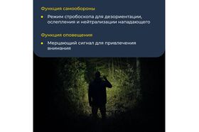 Режим стробоскопа для ситуации SOS и самообороны. Режим стробоскопа можно использовать в целях обороны. Одна из основных целей режима «стробоскоп» – дезориентировать, ослепить и психологически нейтрализовать нападающего. Также в экстренной ситуации мерцающим сигналом легче привлечь внимание – например, если человек заблудился в лесу.