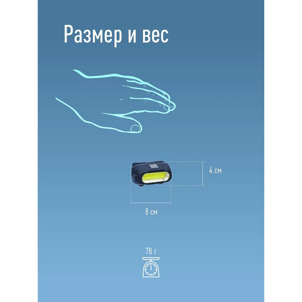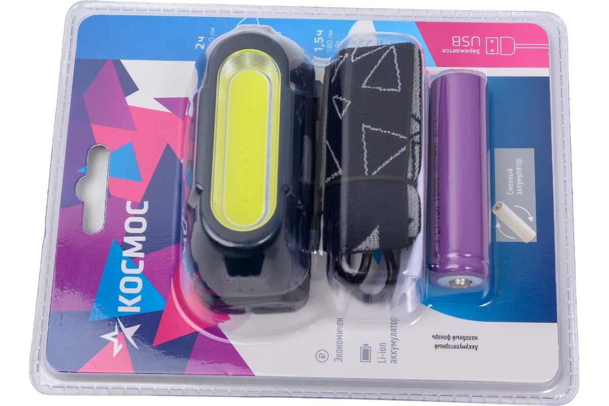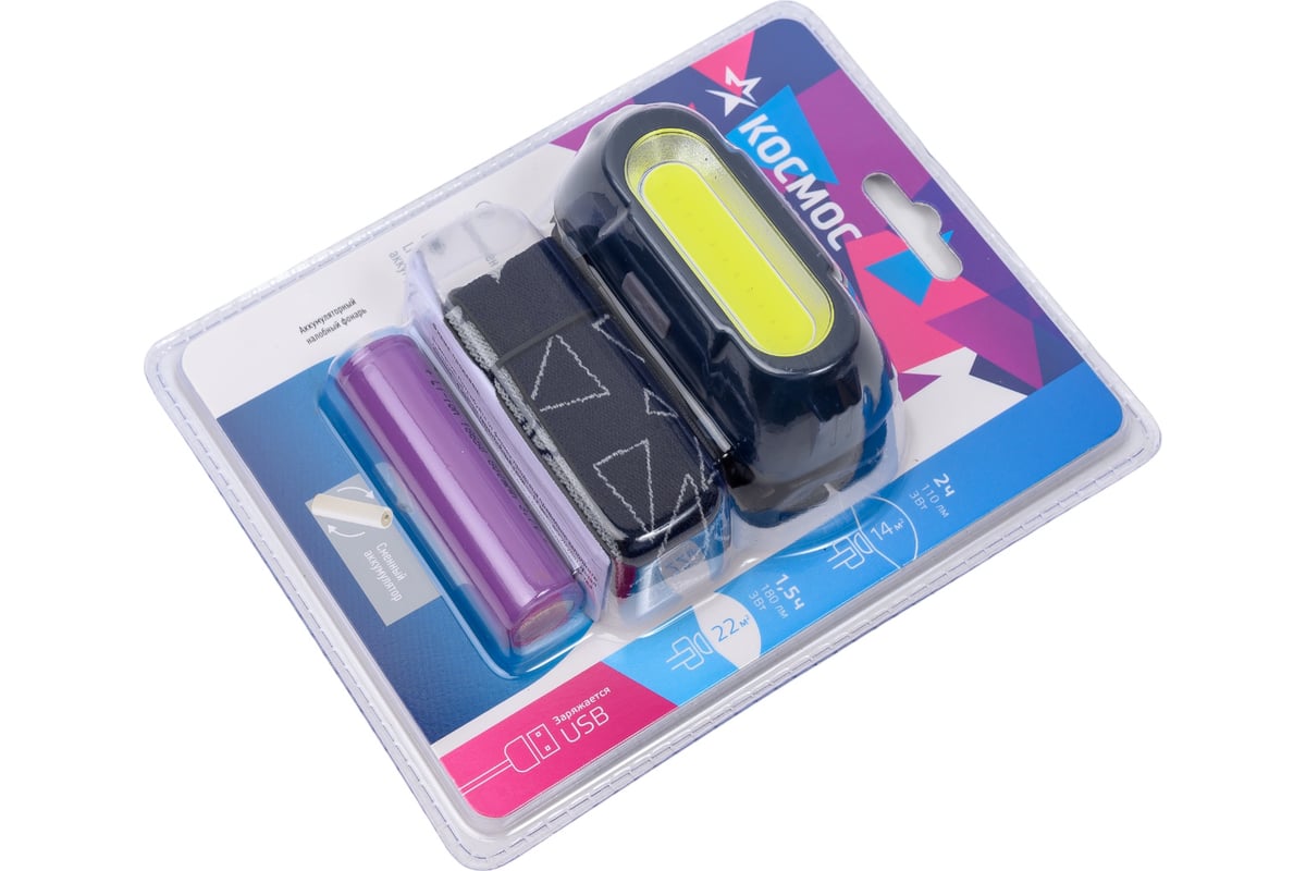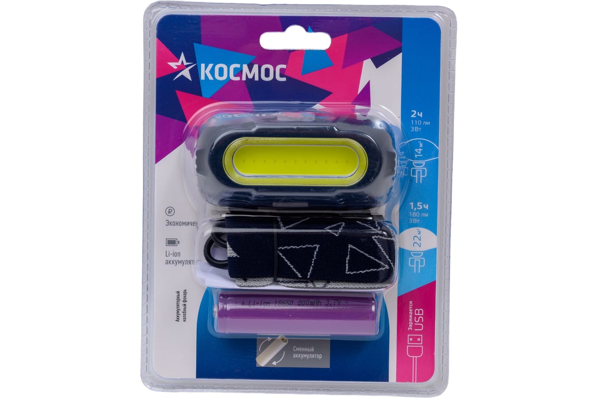 Фонарь налобный КОСМОС (KOC514Lit) - практичный выбор. Источник света: 3Вт COB LED. Источник питания: съемный Li-ion аккумулятор 18650 3,7В 800 мА/ч, зарядный USB-шнур type C в комплекте.