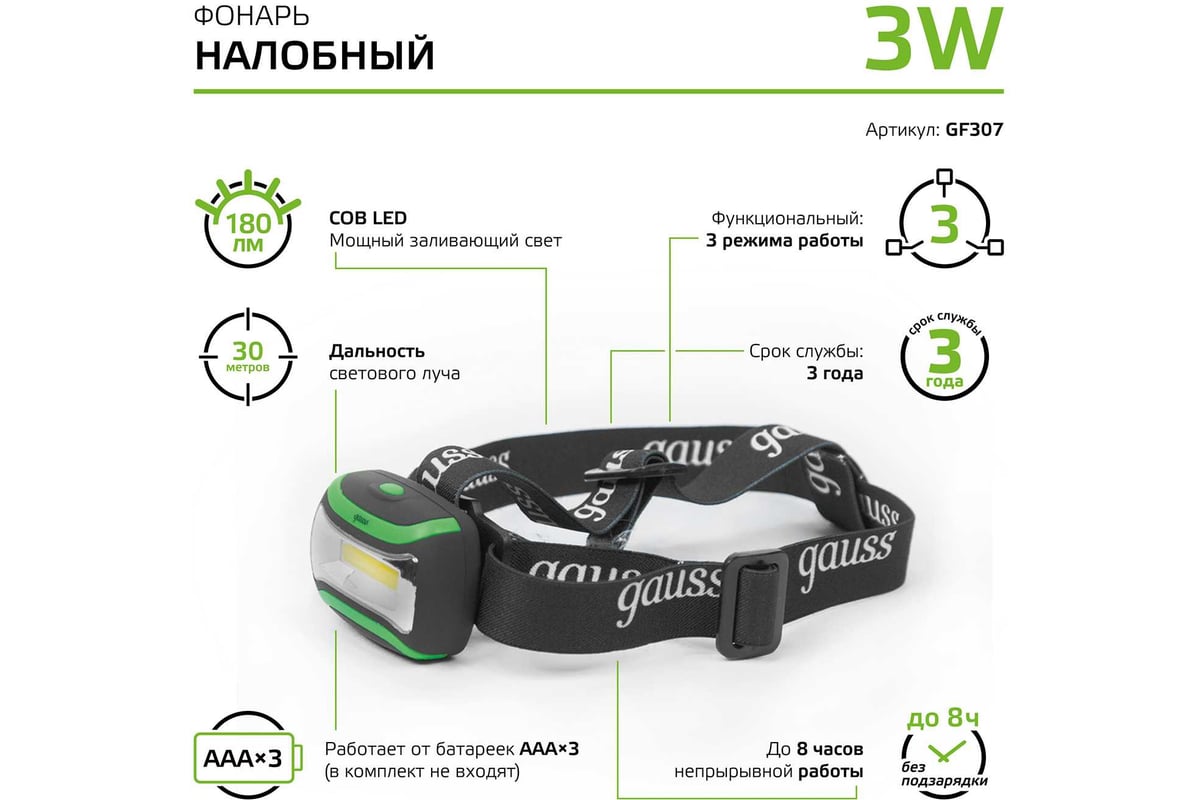 Фонарь налобный Gauss модель GFL307 3W 180lm 3xААА LED - это компактный налобный фонарь с проработанным дизайном, который станет надежным спутником в любых условиях. С мощностью 3W и яркостью 180lm, оснащенный тремя батарейками типа 3хAAA, этот фонарь гарантирует длительную и яркую работу благодаря светодиоду COB. Удобный эластичный головной ремень обеспечивает комфортное использование и надежную фиксацию на голове. Стильный современный дизайн делает эту модель не только функциональным, но и стильным аксессуаром.