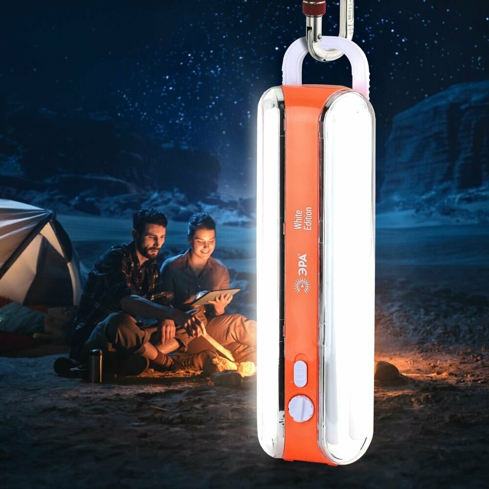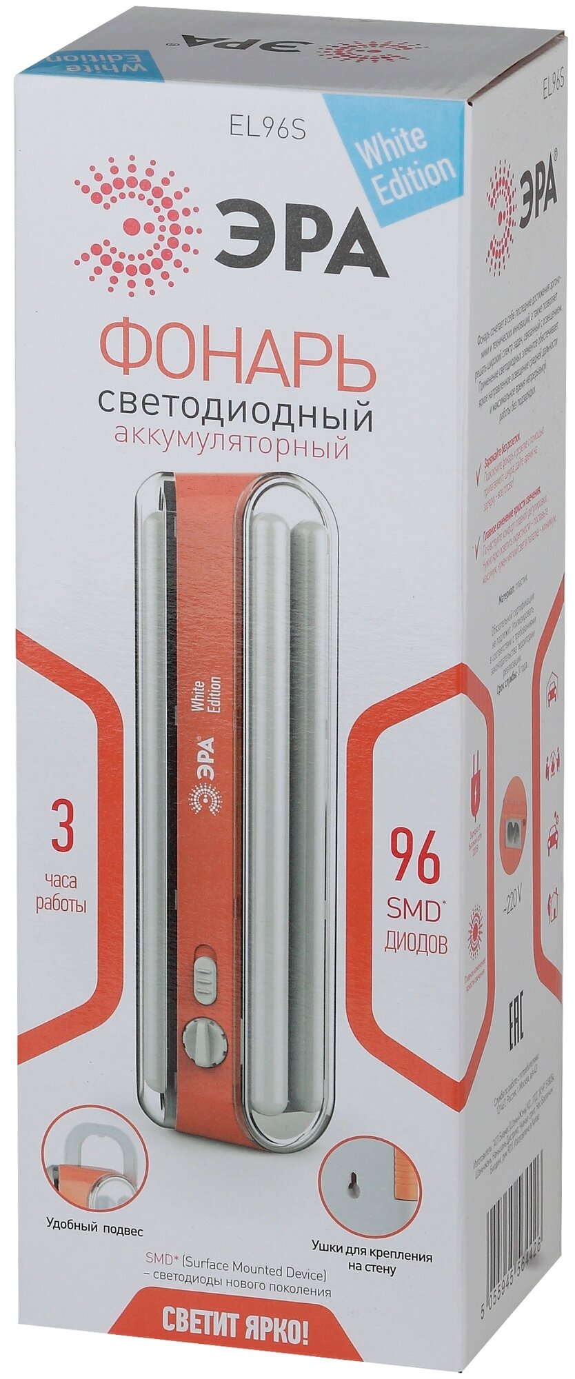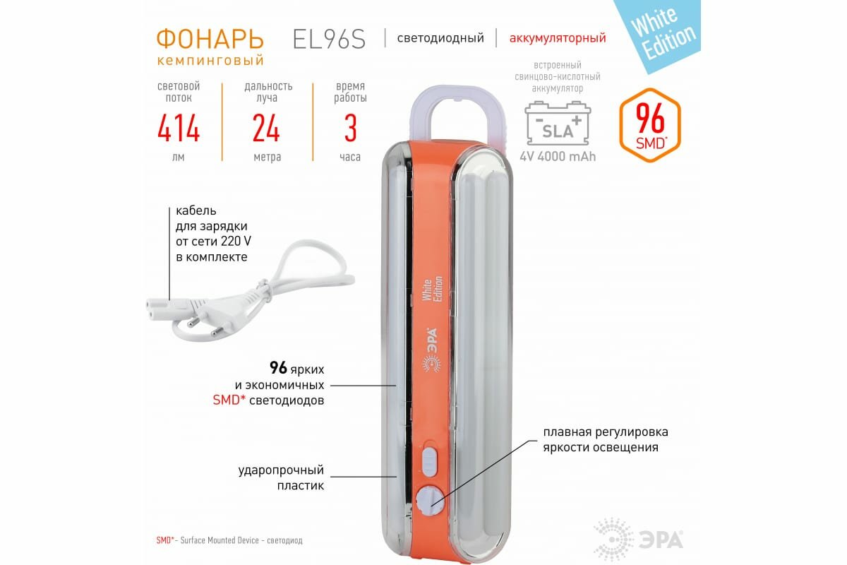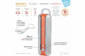 Фонарь ЭРА EL96S кку 4V4Ah, 96SMD, ЗУ 220V Б0026988 для экстренного освещения EL96S - светит с максимально возможной яркостью. Количество светодиодов в фонаре 96, 4 колбы: в каждой - по 24 диода. Для максимального освещения можно включить все колбы сразу, а для экономного освещения - две. Регулируется яркость освещения плавным диммером. Фонарь оборудован светодиодами нового поколения (SMD), такие светодиоды ярче стандартных на 50%, а цветовая температура более естественная, фонарь светит белым светом без синевы. Дальность луча составляет 24 метра, а световой поток - 414 Лм.