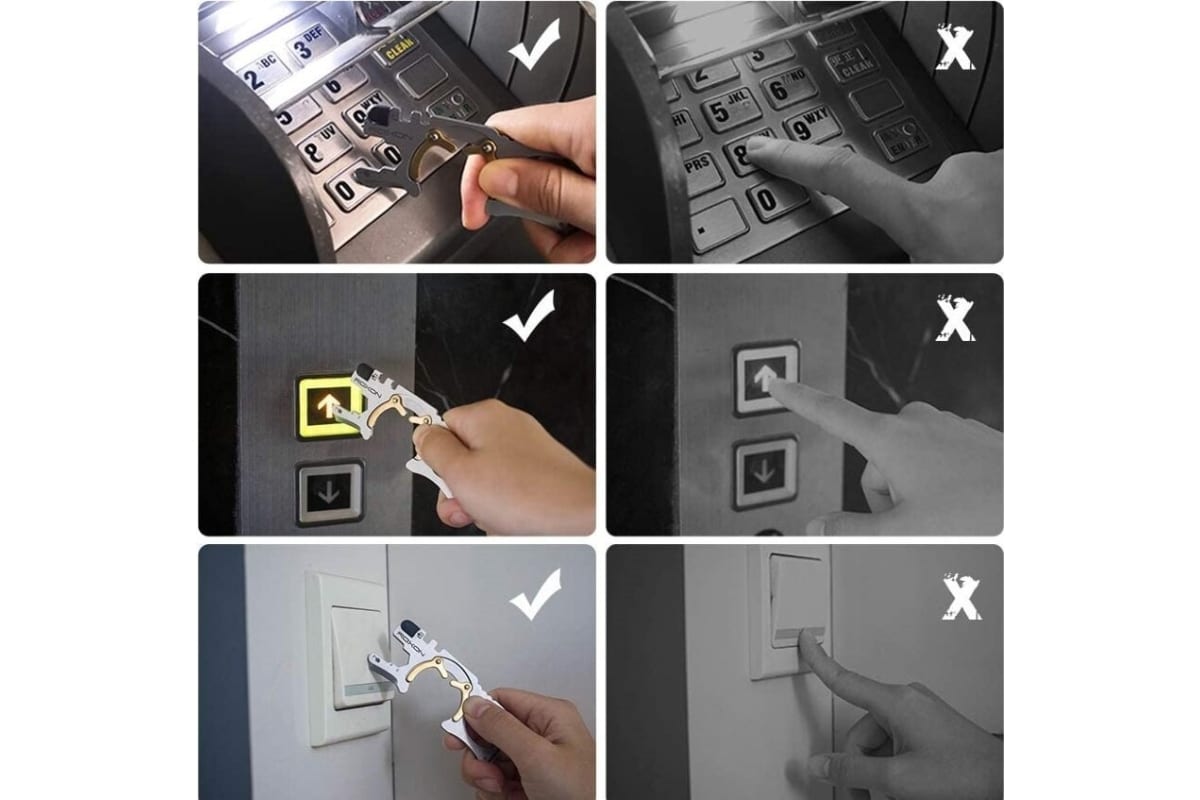 Крючок дверной сделан из натурального антибактериального медного материала, действенного против бактерий и вирусов. Мультитул способствует крепкому захвату и удержанию дверной ручки, без скольжения, гарантируя безопасность. Нажмите, чтобы открыть дверь.