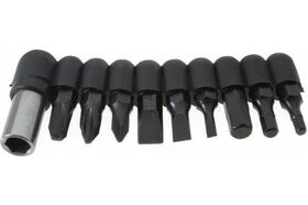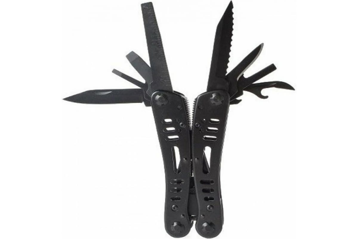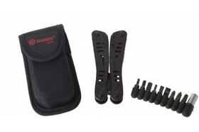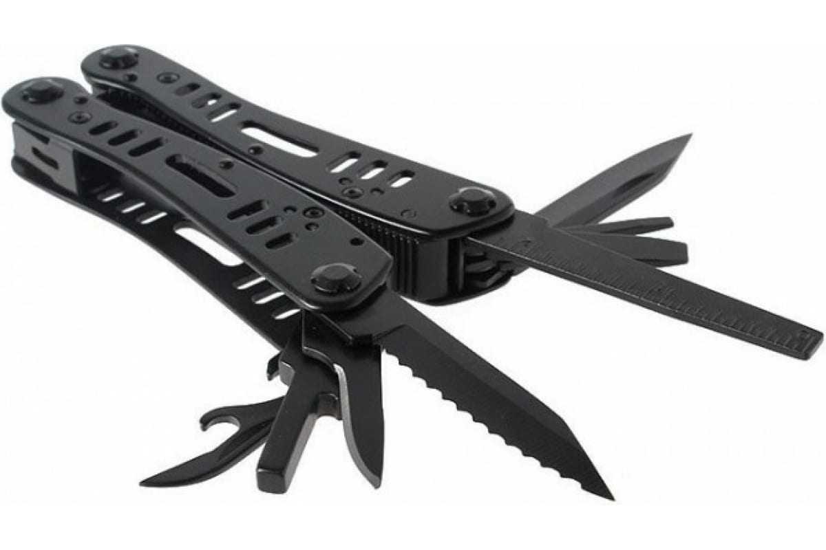 пассатижи, кусачки, маленькая отвертка плоская, плоская отвертка, нож, серрейтор, шило, линейка, пилочка, открывалка для бутылок, консервный нож, держатель бит, 9 сменных насадок в комплекте