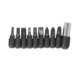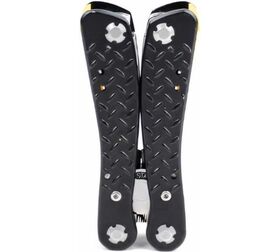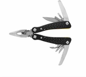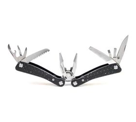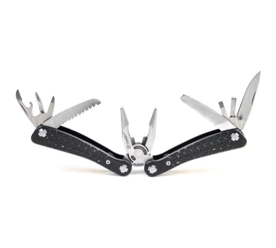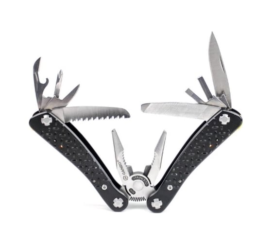 лезвие с прямой заточкой, серрейтор, две плоские отвертки, напильник, шило, открывалка для бутылок, консервный нож, держатель для бит