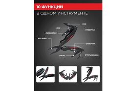 Плоскогубцы,кусачки,нож с прямой заточкой,нож с серрейторной заточкой,открывалка для бутылок и консервных банок,шило,большая шлицевая отвертка-напильник, средняя шлицевая отвертка,маленькая шлицевая отвертка,крестовая отвертка