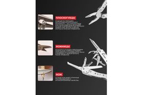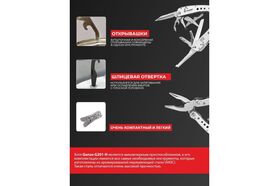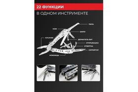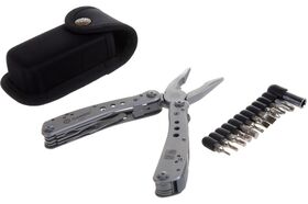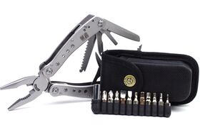 Плоскогубцы,кусачки,пила,нож с прямой заточкой,нож с серрейторной заточкой,ножницы,две шлицевые отвертки разного размера,открывалка для бутылок и консервов,держатель для съемных отверток,магнитный переходник,набор бит.