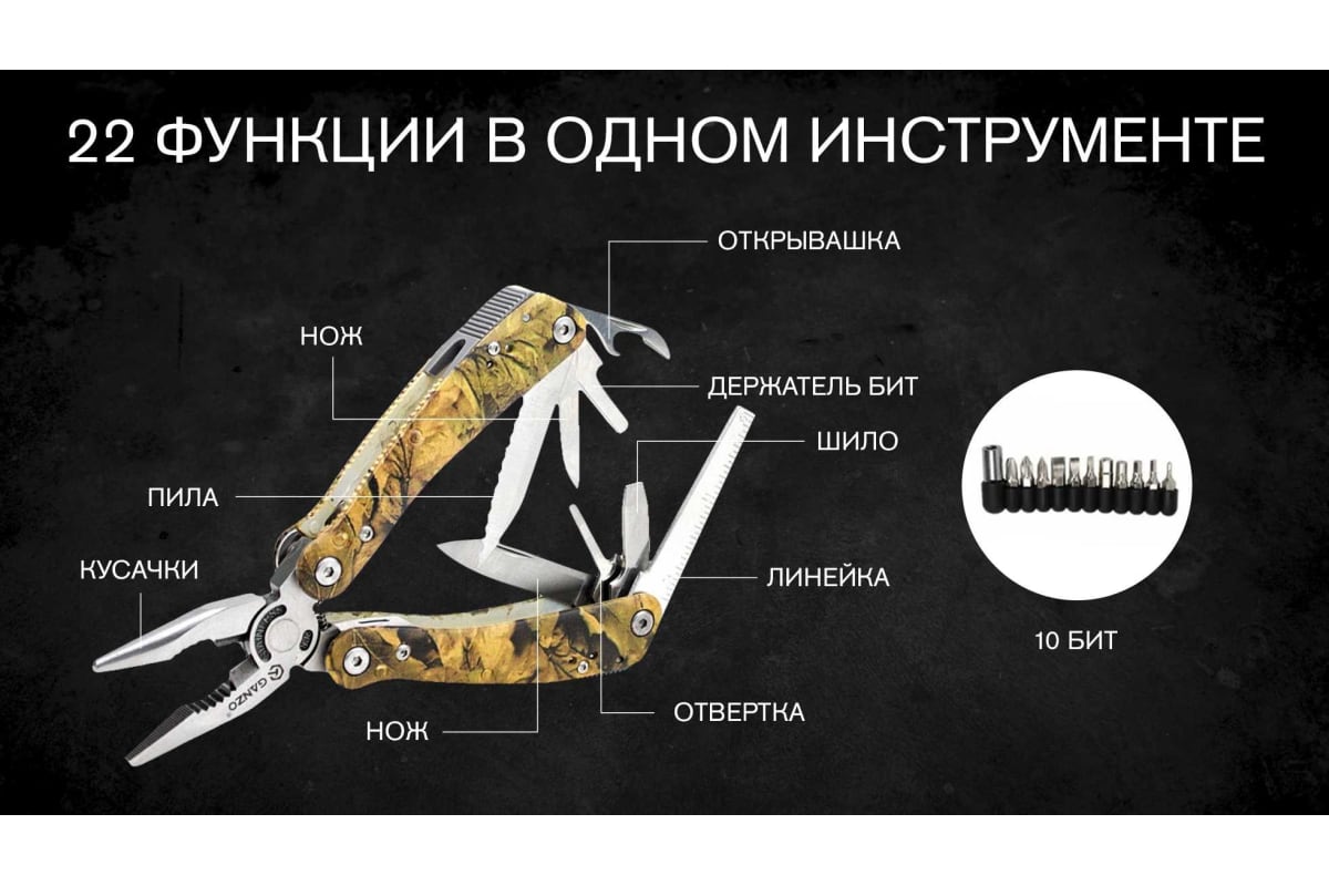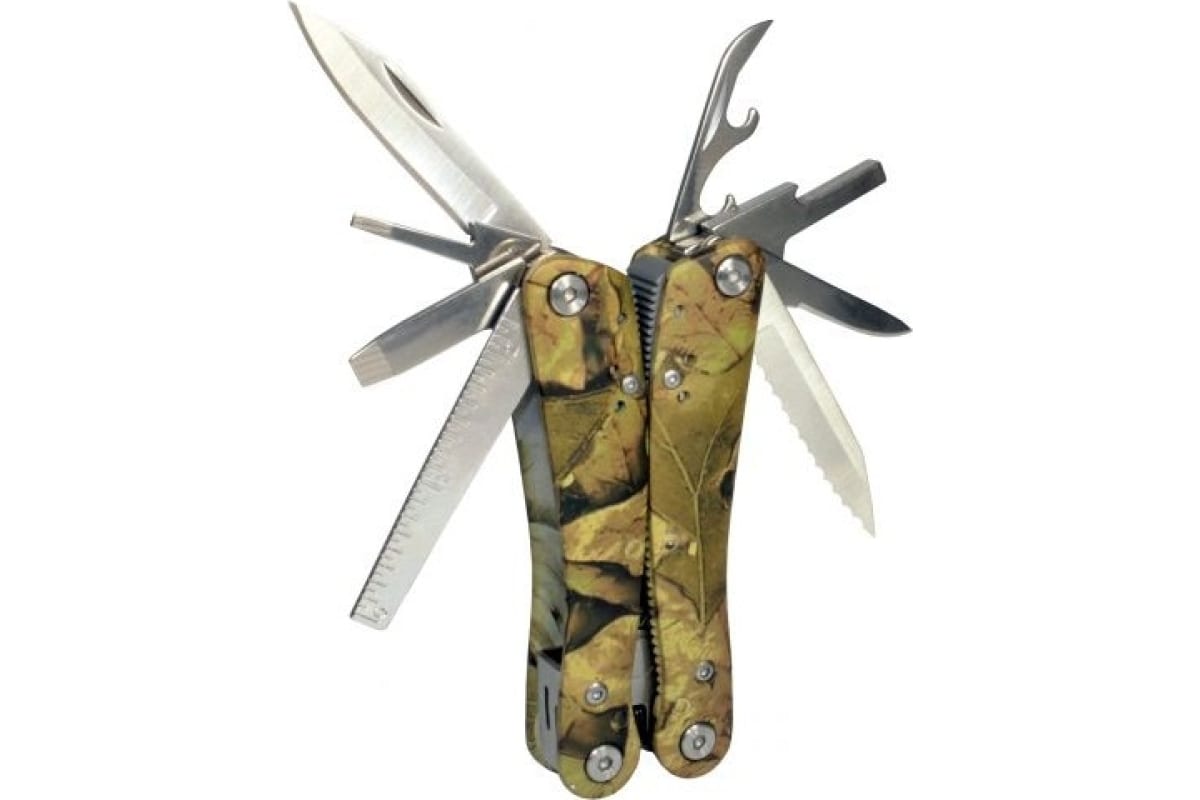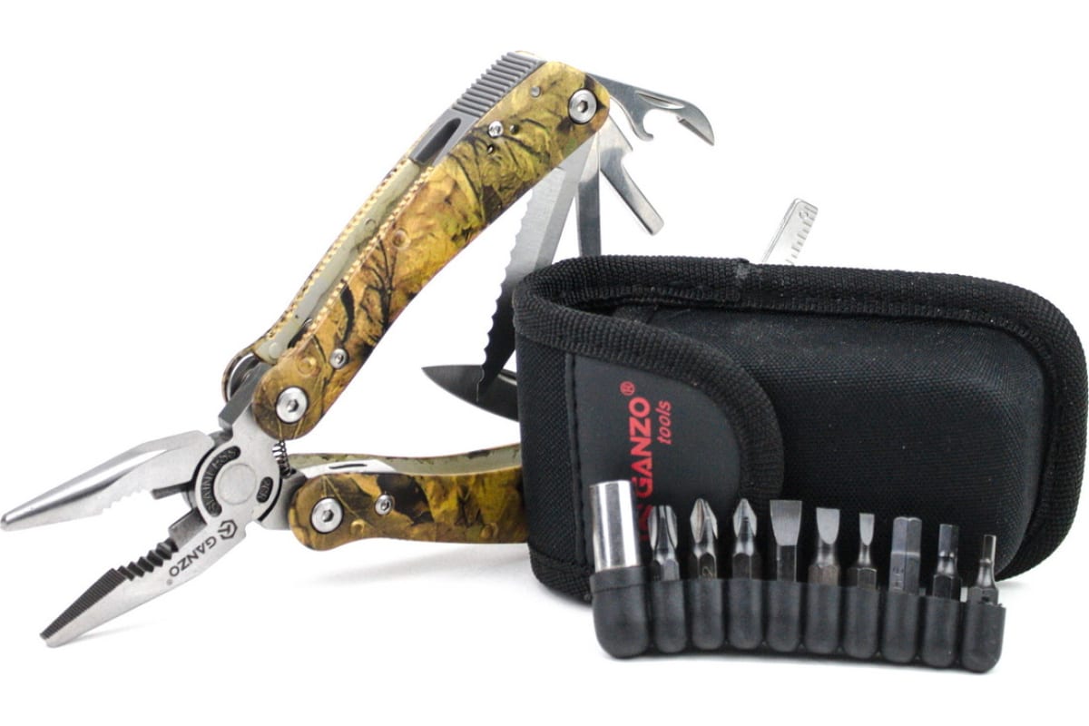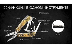 плоскогубцы,кусачки,средняя отвертка плоская,маленькая отвертка плоская,нож,серрейтор,линейка,консервный нож,открывалка для бутылок,напильник,шило,держитель бит,10 сменных насадок