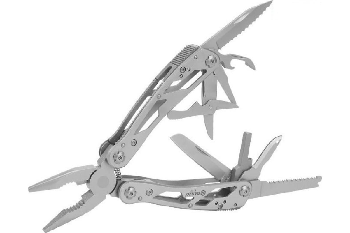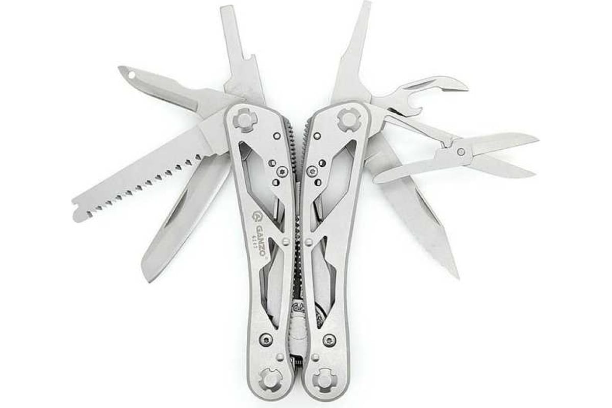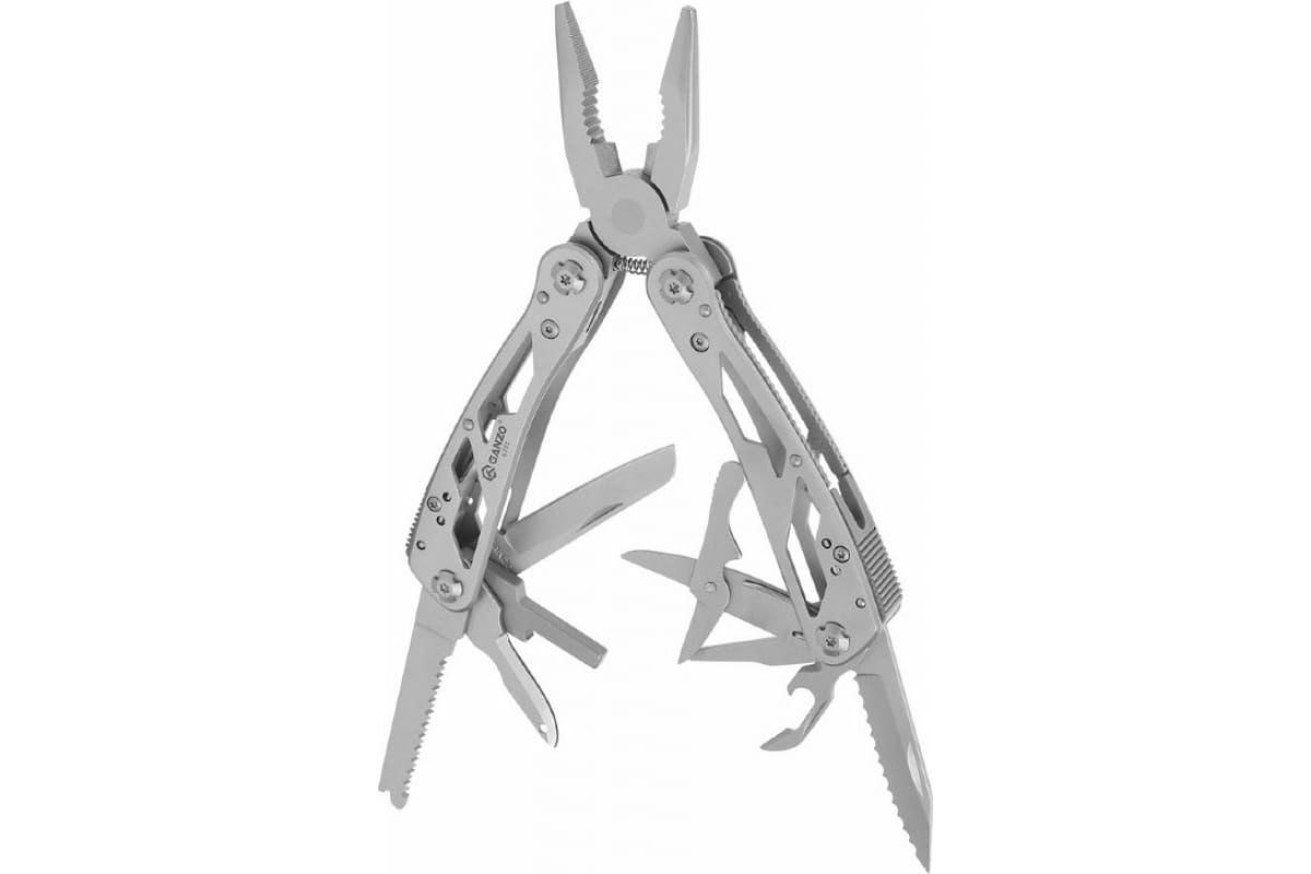 Стильный мультитул G202 от компании Ganzo. Модель имеет продуманный дизайн и большой набор инструментов. В комплект входят следующие предметы: подпружиненные плоскогубцы с кусачками, два лезвия, одно из которых имеет серрейторную заточку, плоская отвертка небольшого размера, ножницы, ножовка по дереву, зенковка, удлинитель адаптера для бит открывалки для бутылок и консервов.