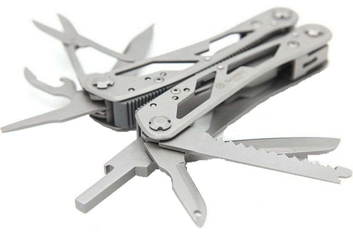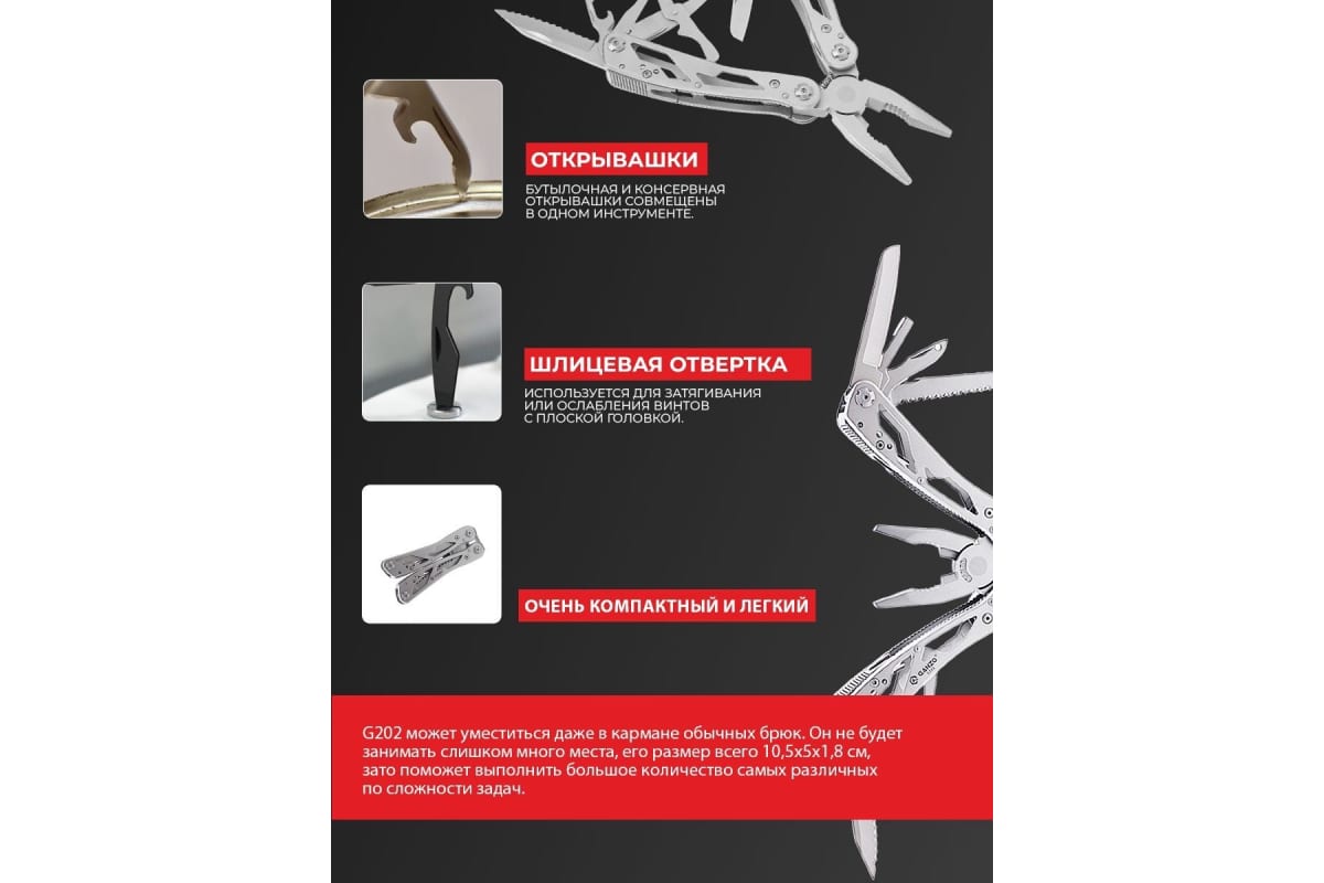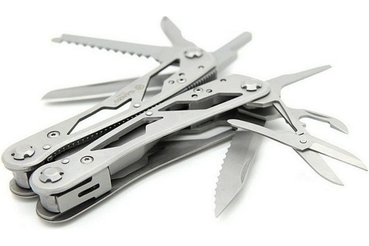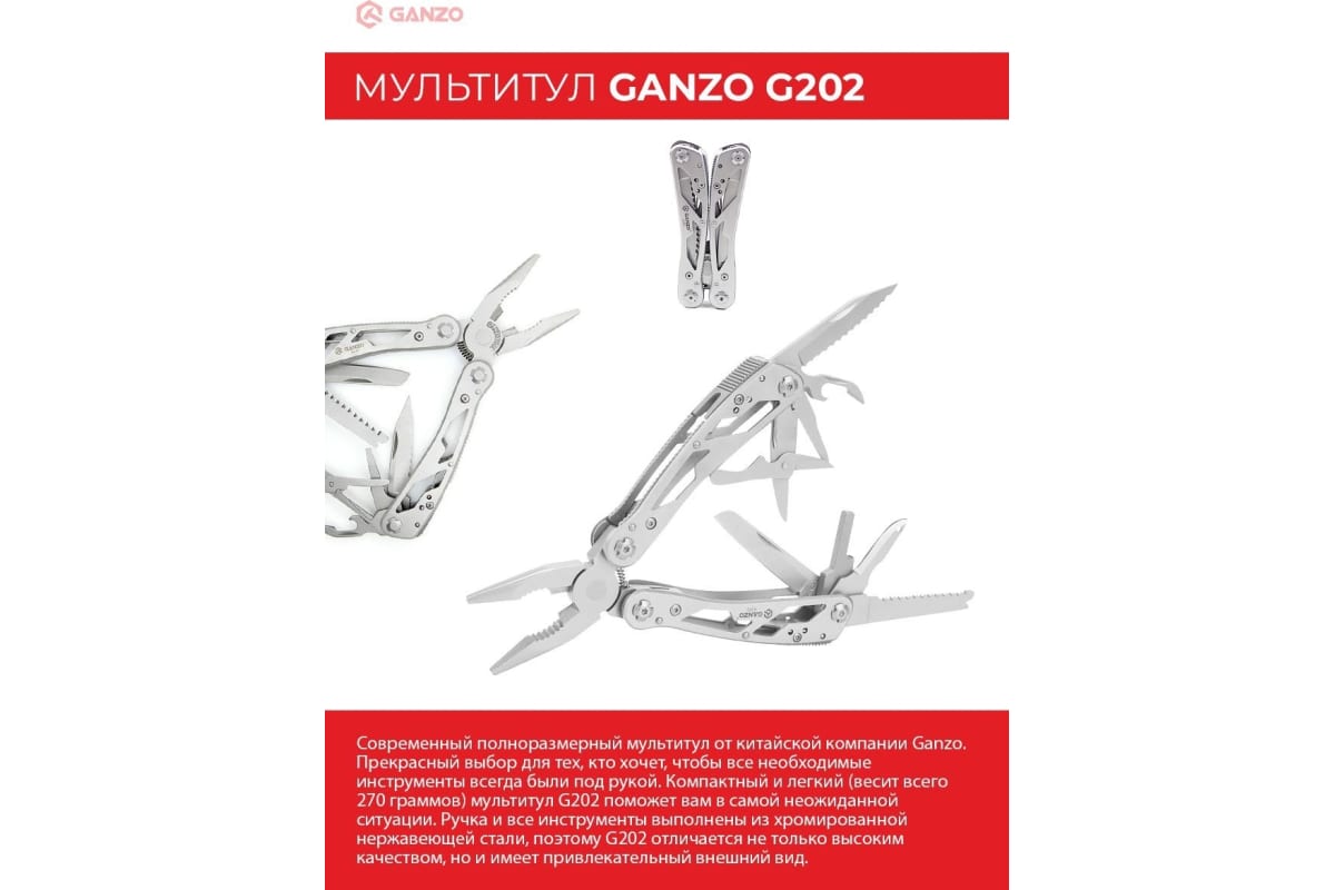Стильный мультитул G202 от компании Ganzo. Модель имеет продуманный дизайн и большой набор инструментов. В комплект входят следующие предметы: подпружиненные плоскогубцы с кусачками, два лезвия, одно из которых имеет серрейторную заточку, плоская отвертка небольшого размера, ножницы, ножовка по дереву, зенковка, удлинитель адаптера для бит открывалки для бутылок и консервов.