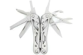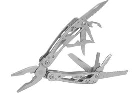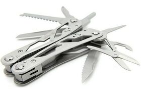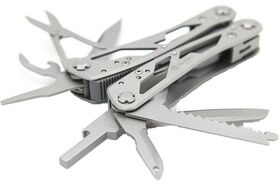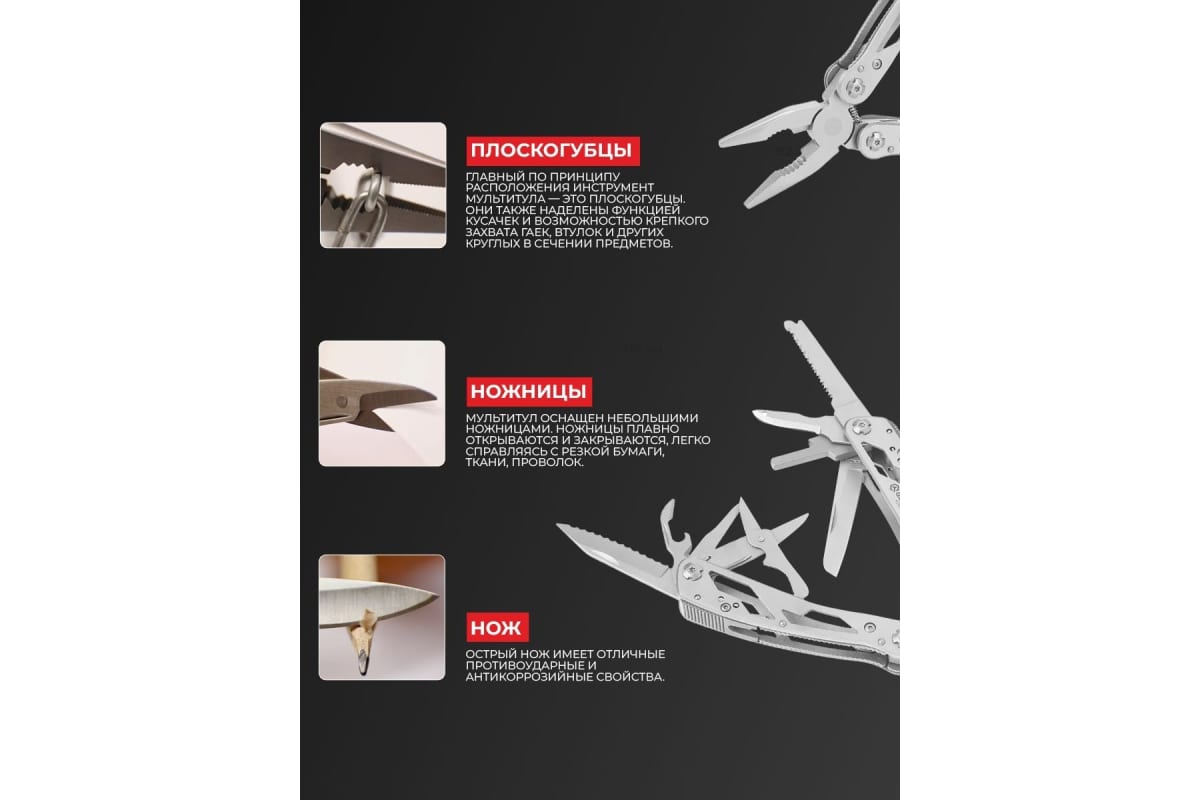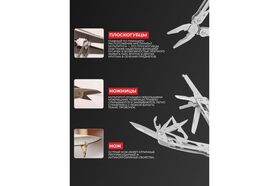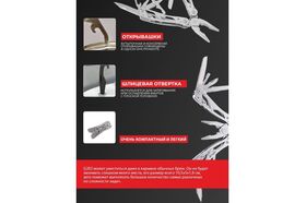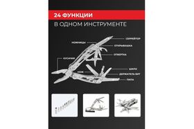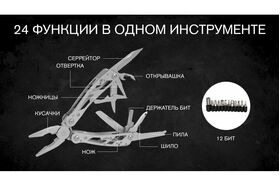 плоскогубцы, кусачки, маленькая отвертка плоская, нож, серрейтор, консервный нож, открывалка для бутылок, для снятии изоляции, пила, захват для гаек и цилиндров, ножницы, шило, держатель бит, 12 сменных насадок