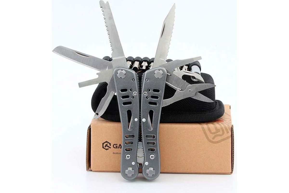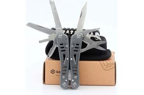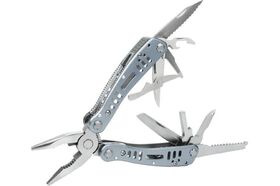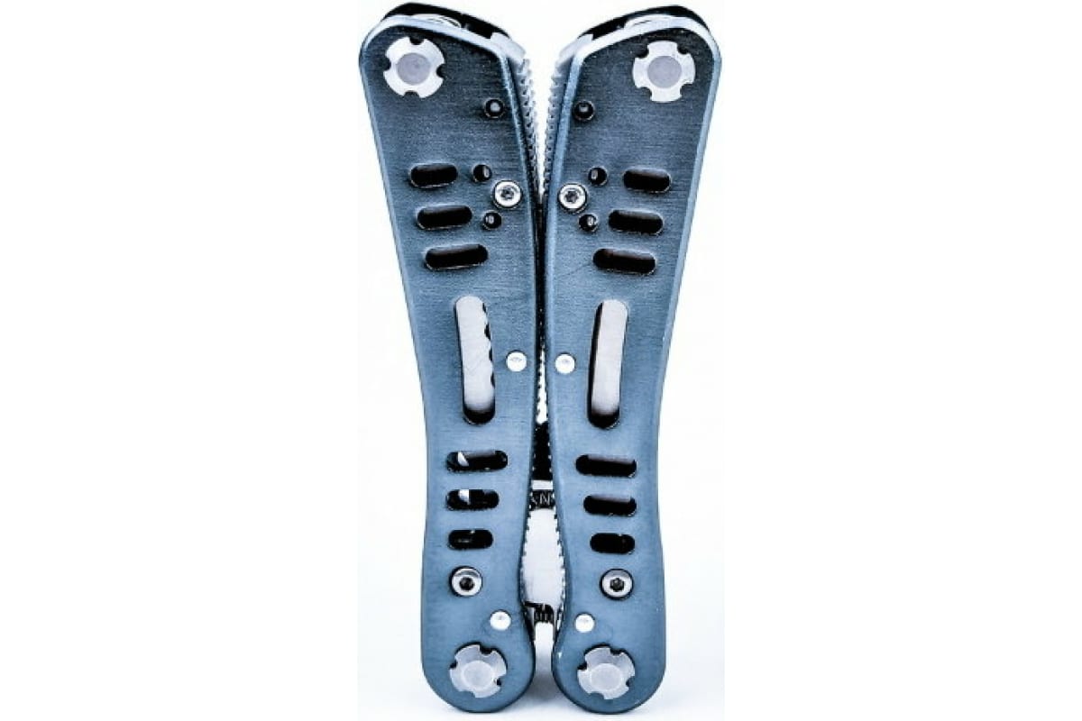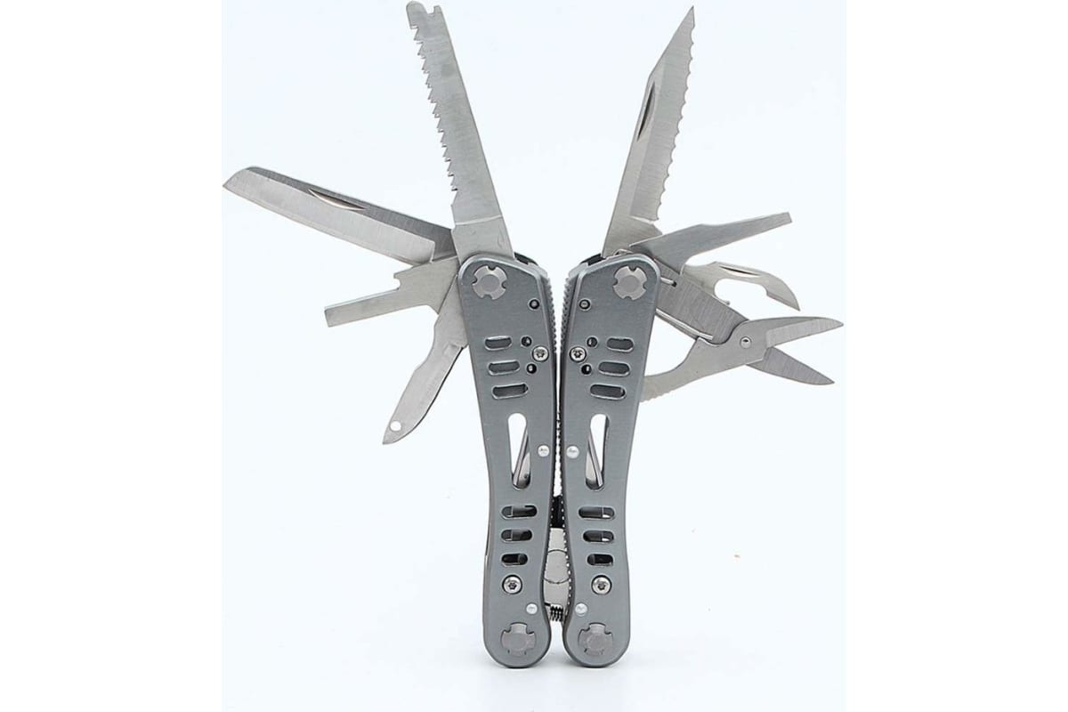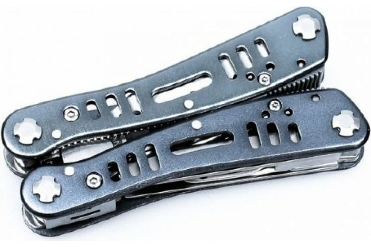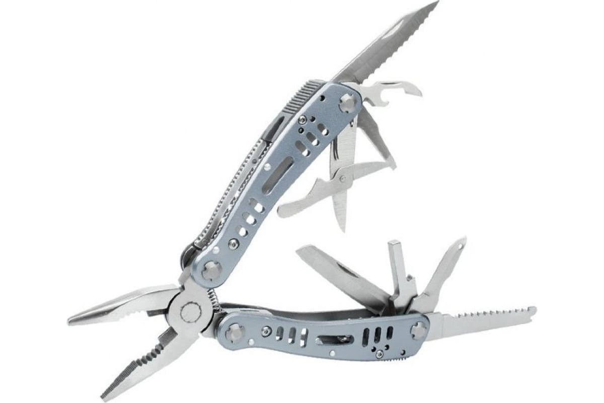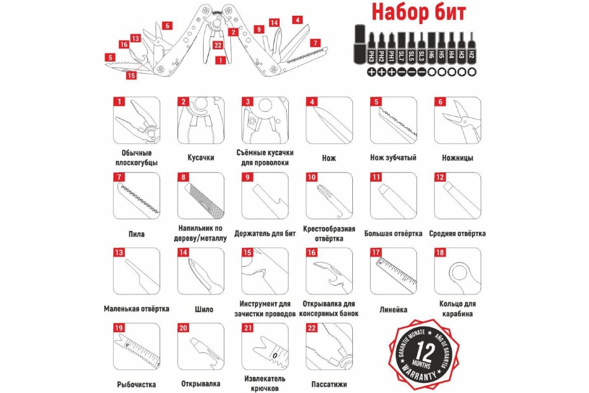 Плоскогубцы,кусачки,захват для круглых предметов,пила,два ножа разной заточки,ножницы,отвертка,открывалка,пила, шило, держатель для бит,набор съемных бит.