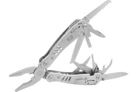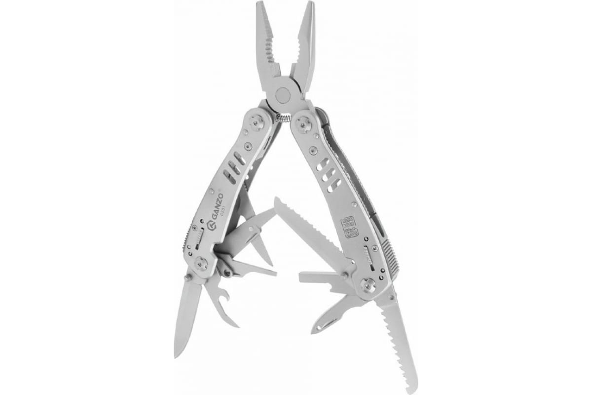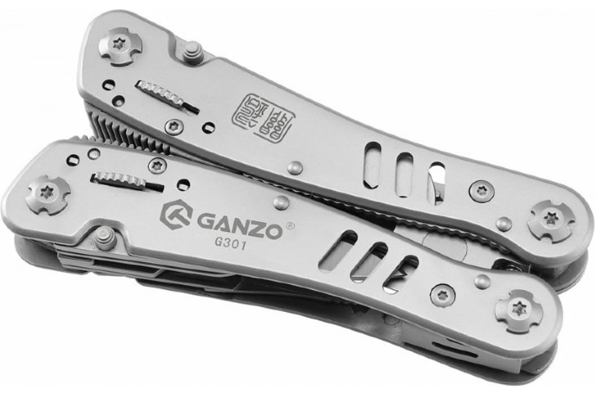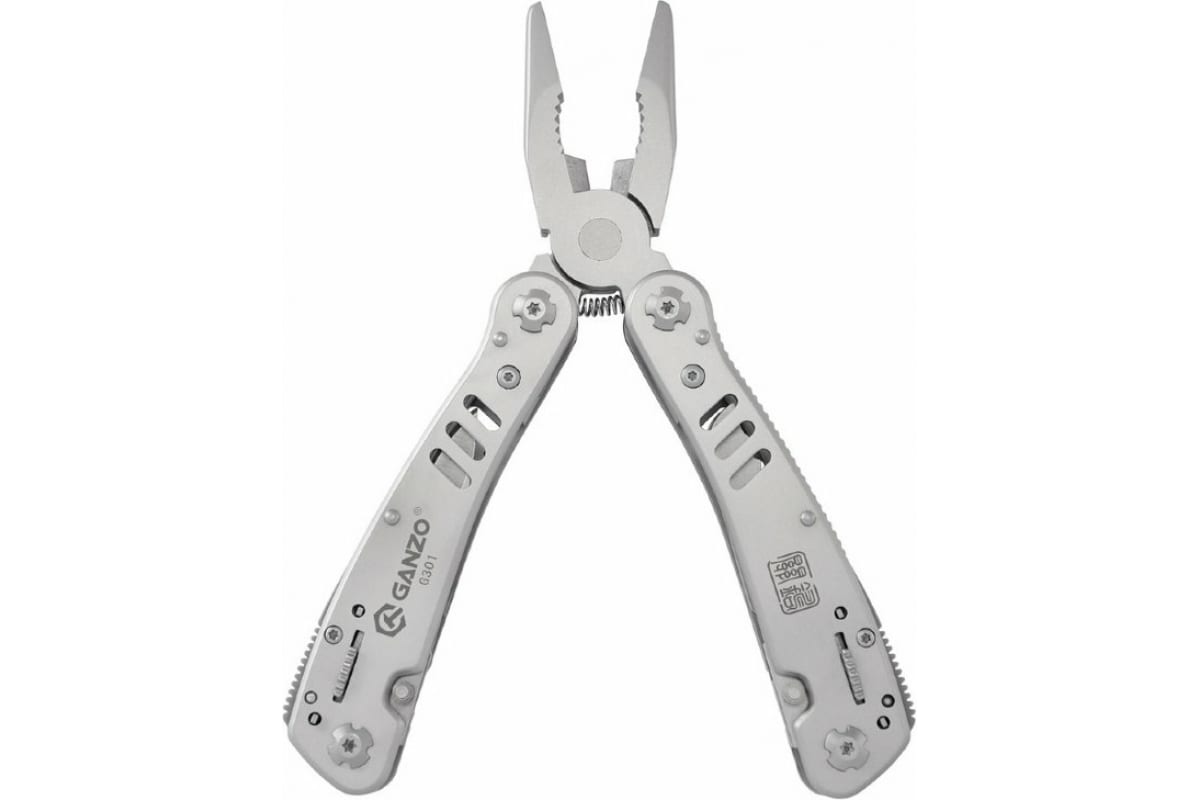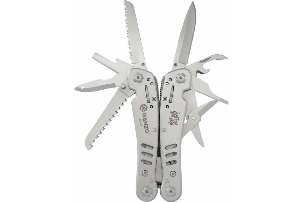Большой набор инструментов позволяет использовать модель G301 для полноценного ремонта разнообразной техники. В комплект мультитула G301 входят следующие инструменты: подпружиненные плоскогубцы с кусачками, два лезвия, одно из которых имеет серрейторную заточку, две плоских отвертки разного размера, пилу по дереву, ножницы, зенковку, удлинитель для адаптера, консервный нож.