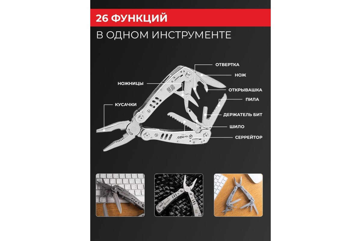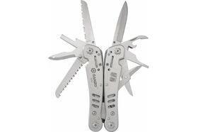 плоскогубцы, кусачки, маленькая отвертка плоская, нож, серрейтор, консервный нож, открывалка для бутылок, для снятии изоляции, пила, захват для гаек и цилиндров, ножницы, шило, кольцо для подвеса, держатель бит, 12 сменных насадок