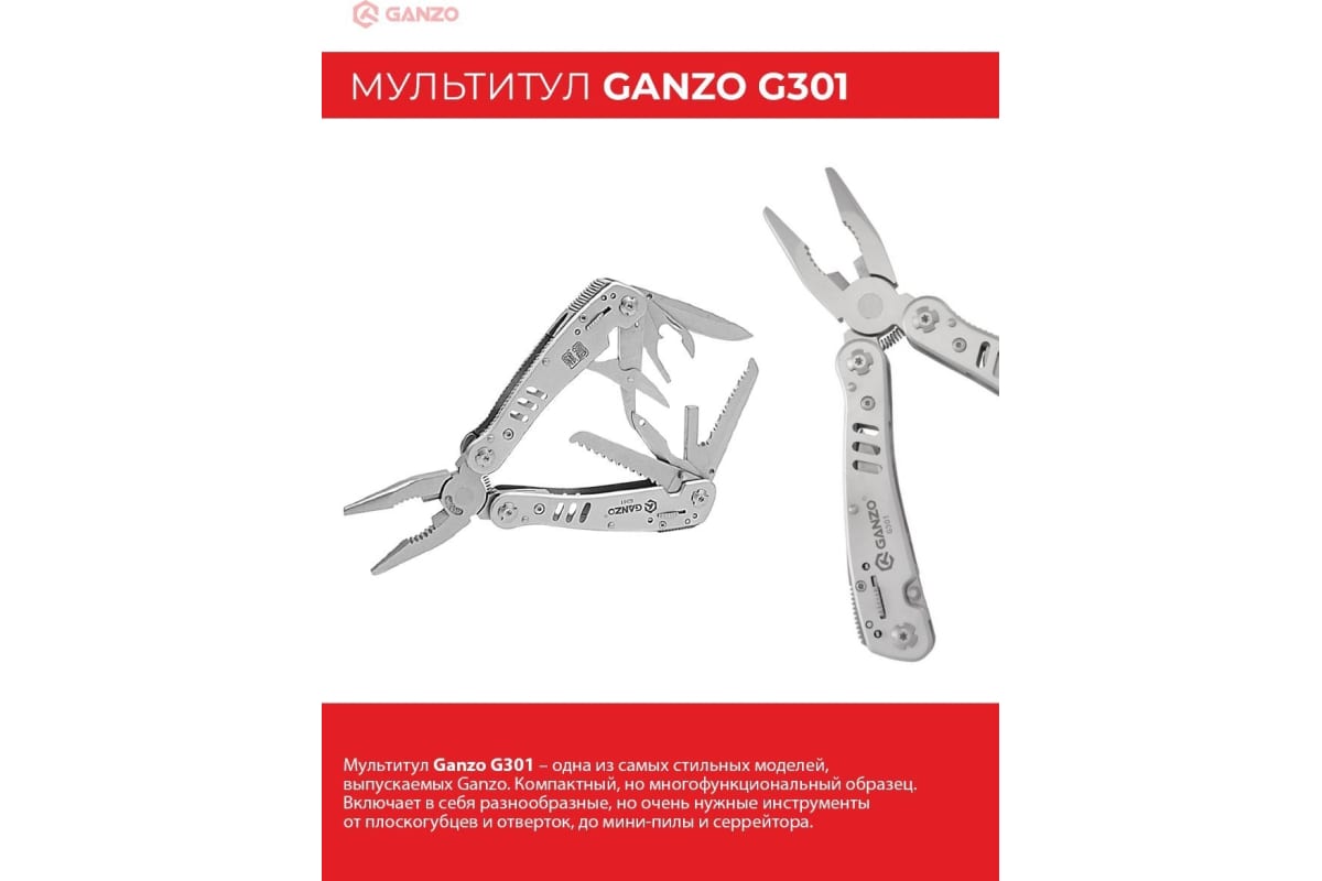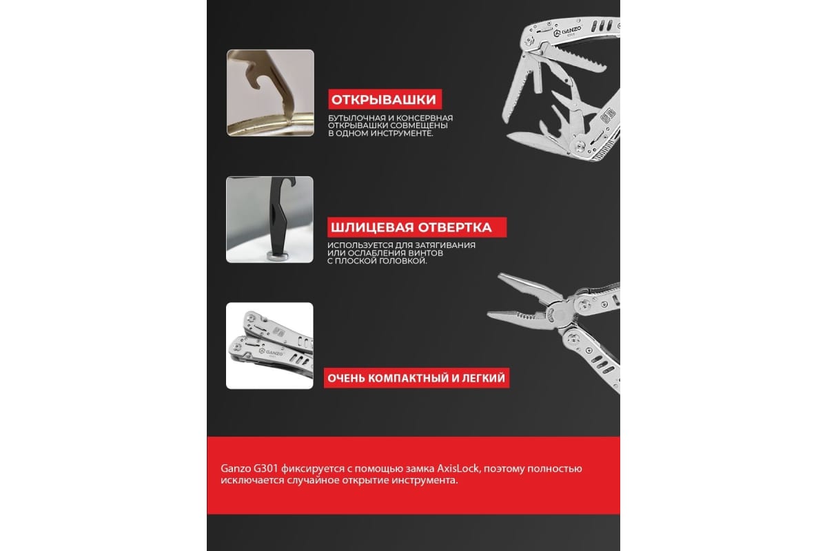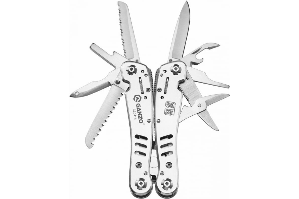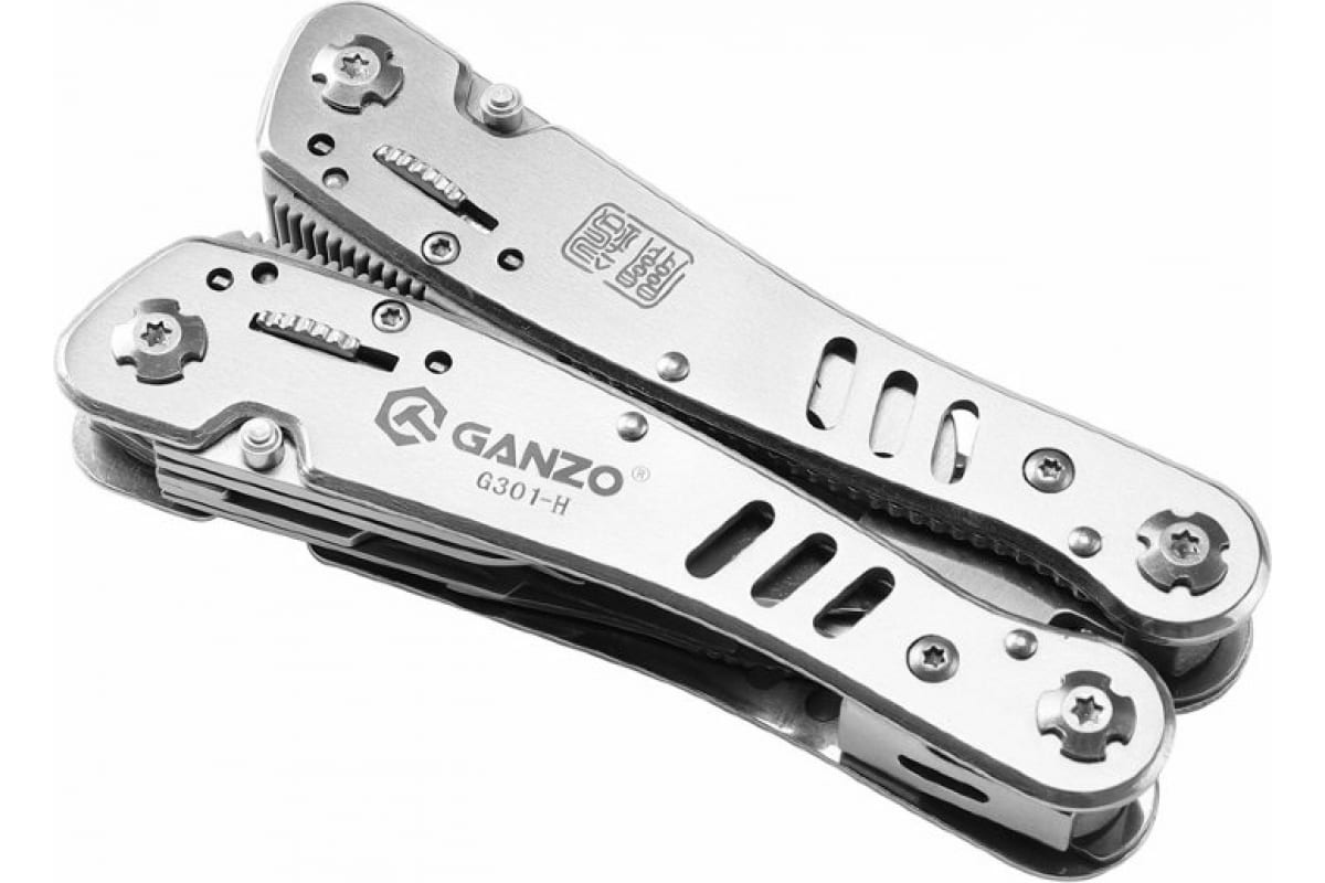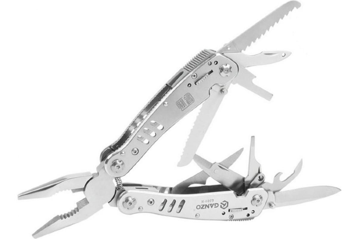 Большой набор инструментов позволяет использовать модель G301-H для полноценного ремонта разнообразной техники. В комплект мультитула G301-H входят следующие инструменты: подпружиненные плоскогубцы с кусачками, два лезвия, одно из которых имеет серрейторную заточку, две плоских отвертки разного размера, пилу по дереву, ножницы, зенковку, удлинитель для адаптера, консервный нож. Также в комплект данной модели входит кассета с адаптером и набор разнообразных бит (3 плоских отвертки, 3 крестовых отвертки, 3 шестигранных ключа наиболее популярных размеров).