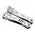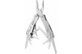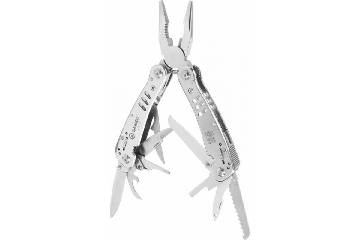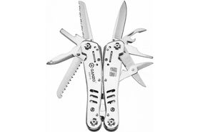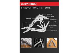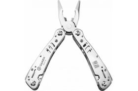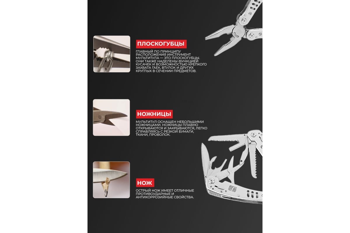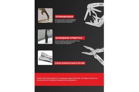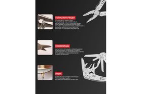 плоскогубцы, кусачки, маленькая отвертка плоская, нож, серрейтор, консервный нож, открывалка для бутылок, для снятии изоляции, пила, захват для гаек и цилиндров, ножницы, шило, кольцо для подвеса, держатель бит, 12 сменных насадок