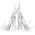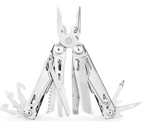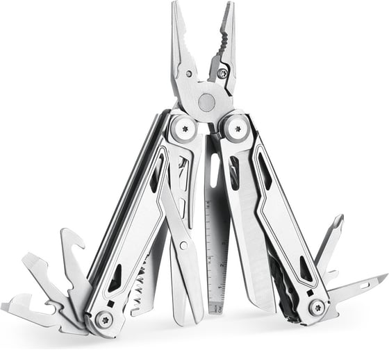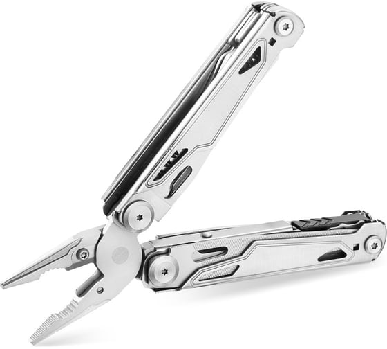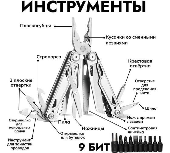кусачки со сменными лезвиями, плоскогубцы, ножницы, пила, нож с прямым лезвием, сантиметровая линейка, шило, стропорез, отверстие для продевания нити, 2 плоские отвертки, крестовая отвертка, инструмент для зачистки проводов, открывалка для бутылок, открыв