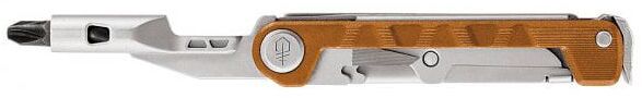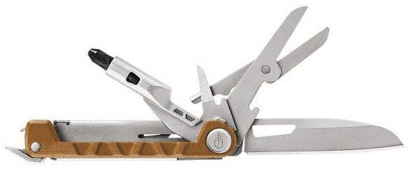 В комплект входят 8 инструментов: лезвие с гладкой кромкой, отвертка Philips, отвертка с плоской головкой, монтировка, молоток, ножницы, шило и открывалка для бутылок