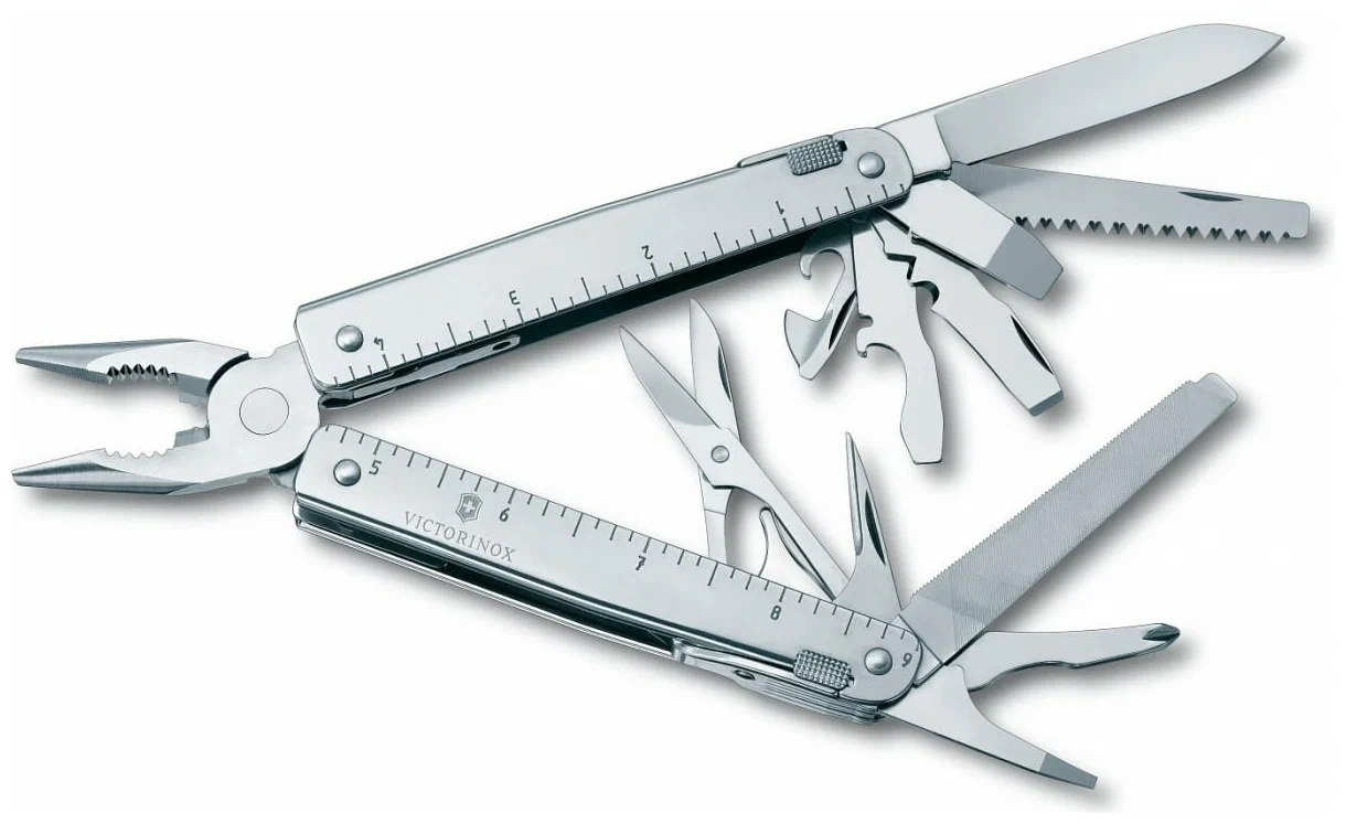 консервный нож, линейка, ножницы, острогубцы, отвертка, открывалка для бутылок, шило / кернер