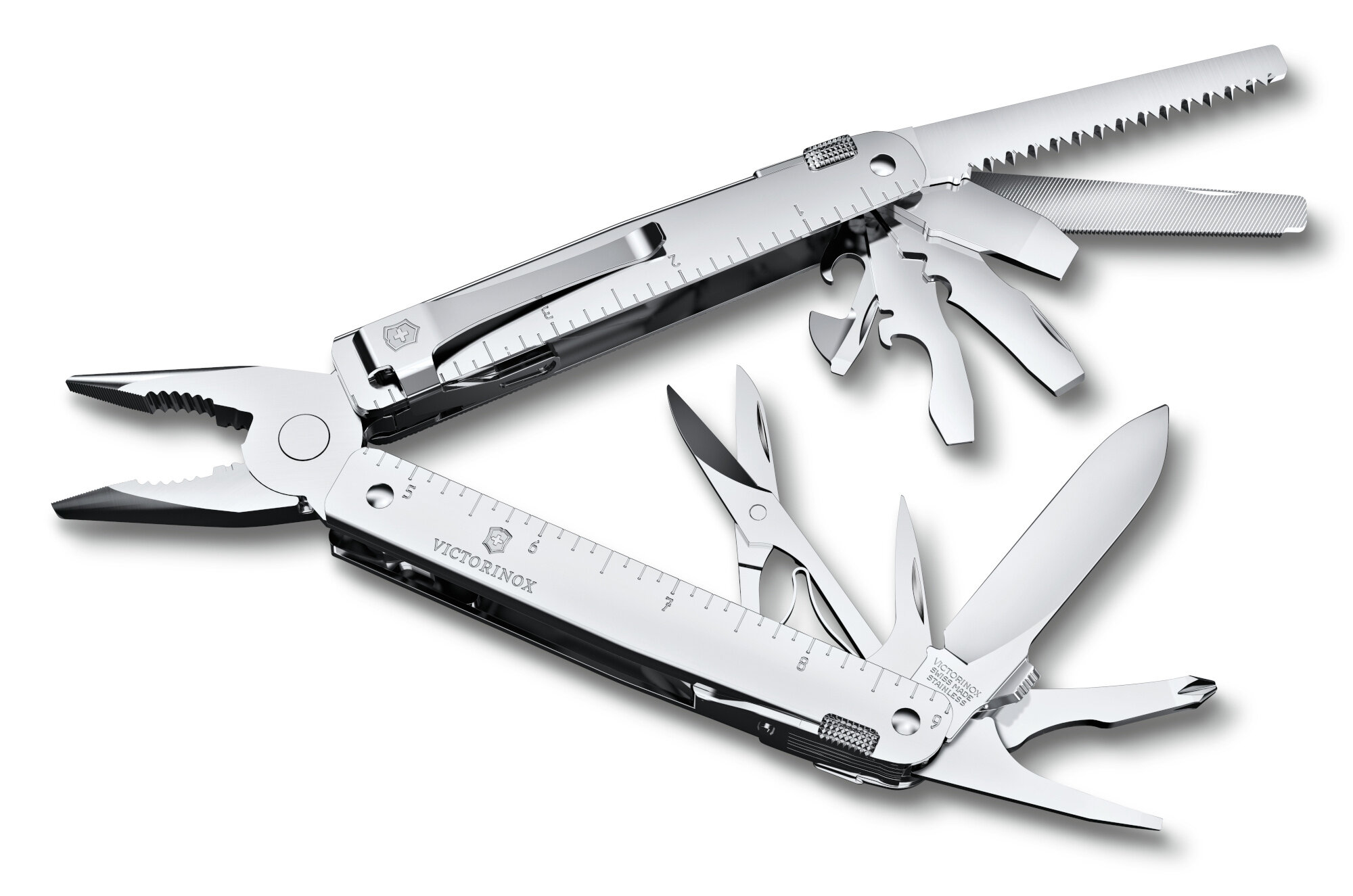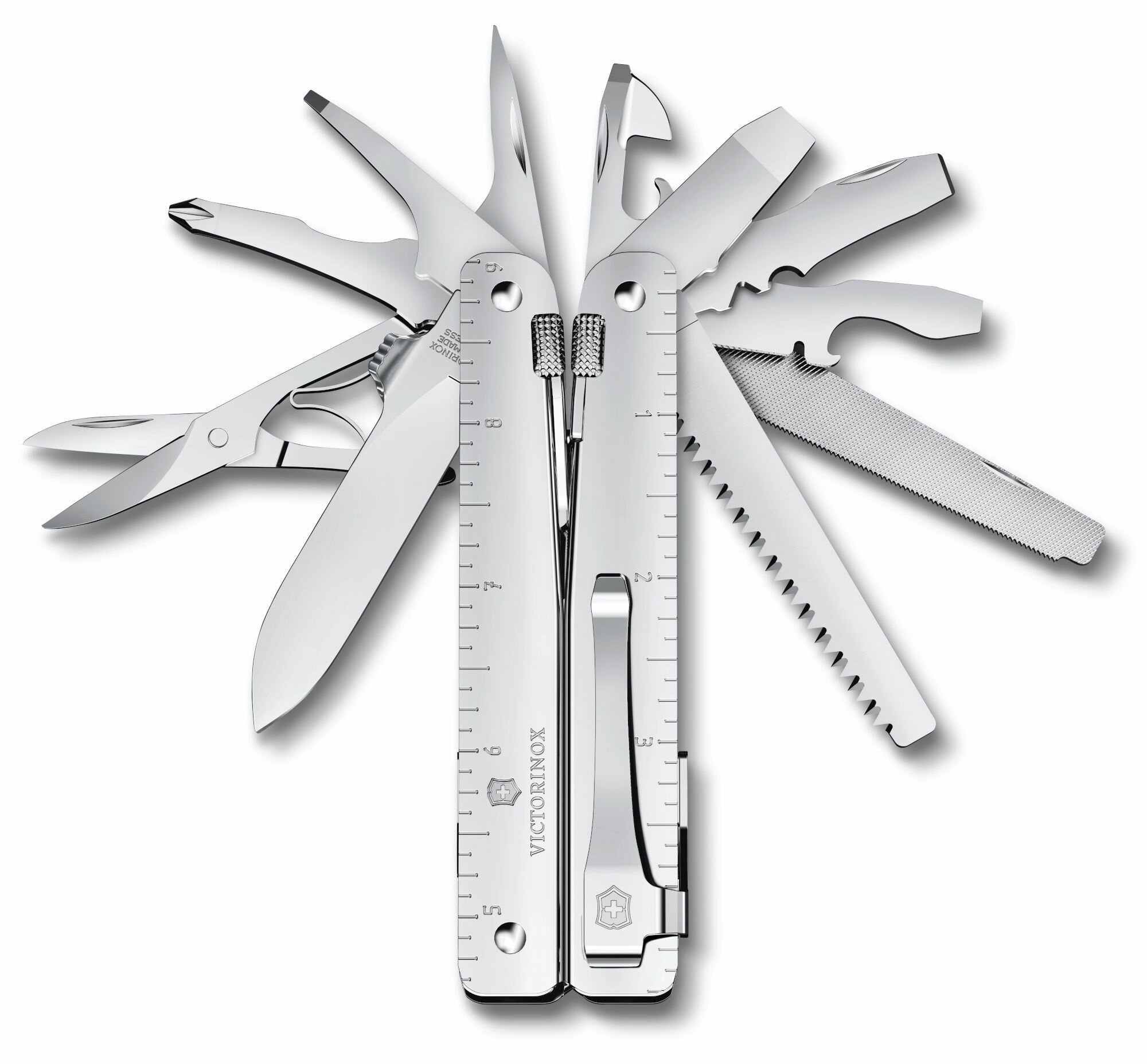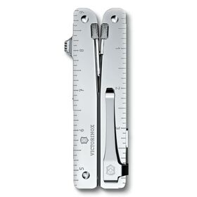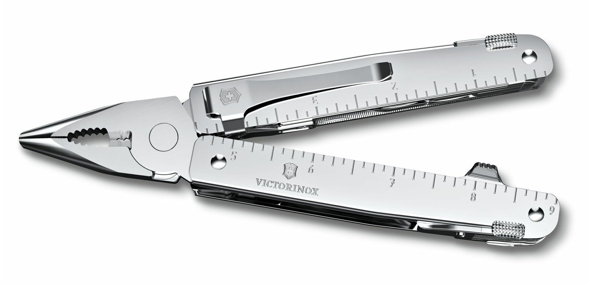 Нержавеющая сталь. Острогубцы, отвертка 2 мм., отвертка 3 мм., инструмент для перекусывания тонкой или мягкой проволоки до 40 HRc, отвертка 5 мм. открывалка для бутылок, отвертка 7.5 мм., лезвие, ножницы, напильник по металлу, ножовка по металлу, пила по дереву, (шило, кернер), крестовая отвертка 1+2 (Стамеска, скребок), мощная фомка, инст. для снятия изоляции, инст. для сгибания проволоки, скребок изоляции, консервный нож, линейка (230 мм.), линейка (9"), электрические щипцы, инст. для перекусывания тв.проволоки, отверстие для шнура, индивидуальные пружины, фиксатор.