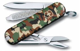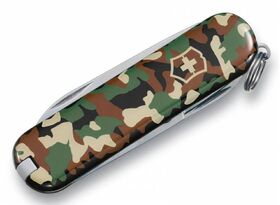 Описание Брендовый нож-брелок Victorinox Classic 58мм с 7-ю функциями. Является миниатюрным вариантом легендарного швейцарского ножа. Нож имеет кольцо на которое можно подвесить ключи. Этот нож будет прекрасным подарком для настоящего мужчины. Дизайн рукояти "Камуфляж"